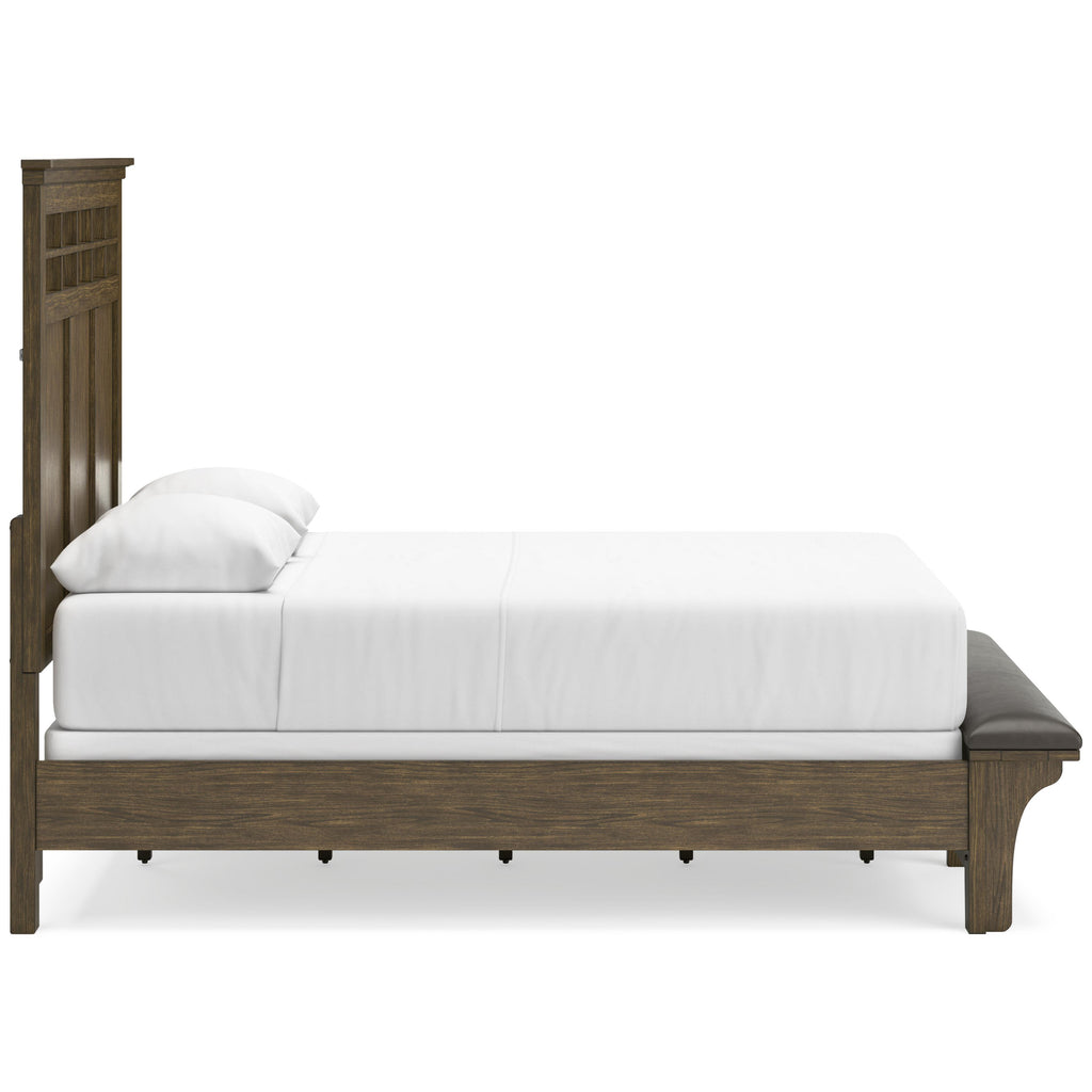 • Includes panel headboard, rails, upholstered bench footboard and slats