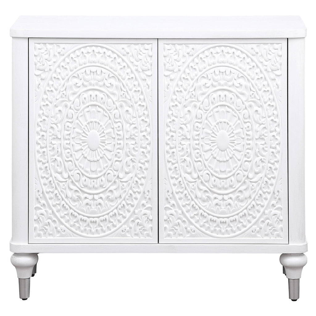 • Bold medallion doors highlight a modern two-door accent cabinet with stylish allure
