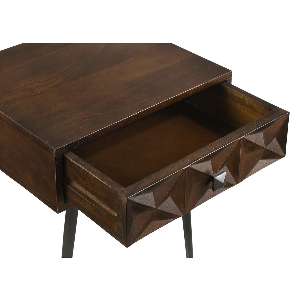 Showcase the striking woodgrains of this solid mango wood accent table, a stylish, eco-friendly addition to a sustainable home. Designed... Showcase the striking woodgrains of this solid mango wood accent table, a stylish, eco-friendly addition to a sustainable home. Designed with flared tapered legs that offer an elegant look, this transitional accent table gives of mid-century vibes and an eclectic touch to a space. The single drawer offers ample space for essentials, keeping the tabletop tidy, and offers a lovely reverse carved motif with a star-like pattern across the front. The drawer also rests on wooden glides and features a single metal knob in a gunmetal finish, matching the finish of the retro-inspired legs. Place this accent table beside an accent chair as a place to keep a book or cup of coffee or allow it to double as a nightstand in compact bedrooms. View more