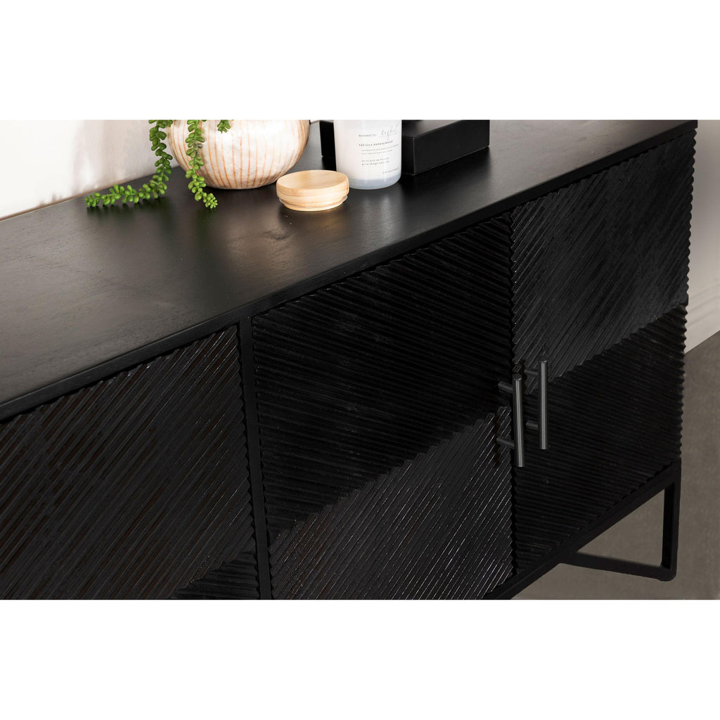 • Bold finish composite wood and iron merge to create a stylish and durable four-door accent cabinet perfect for use in your dining room, living room, or media room
