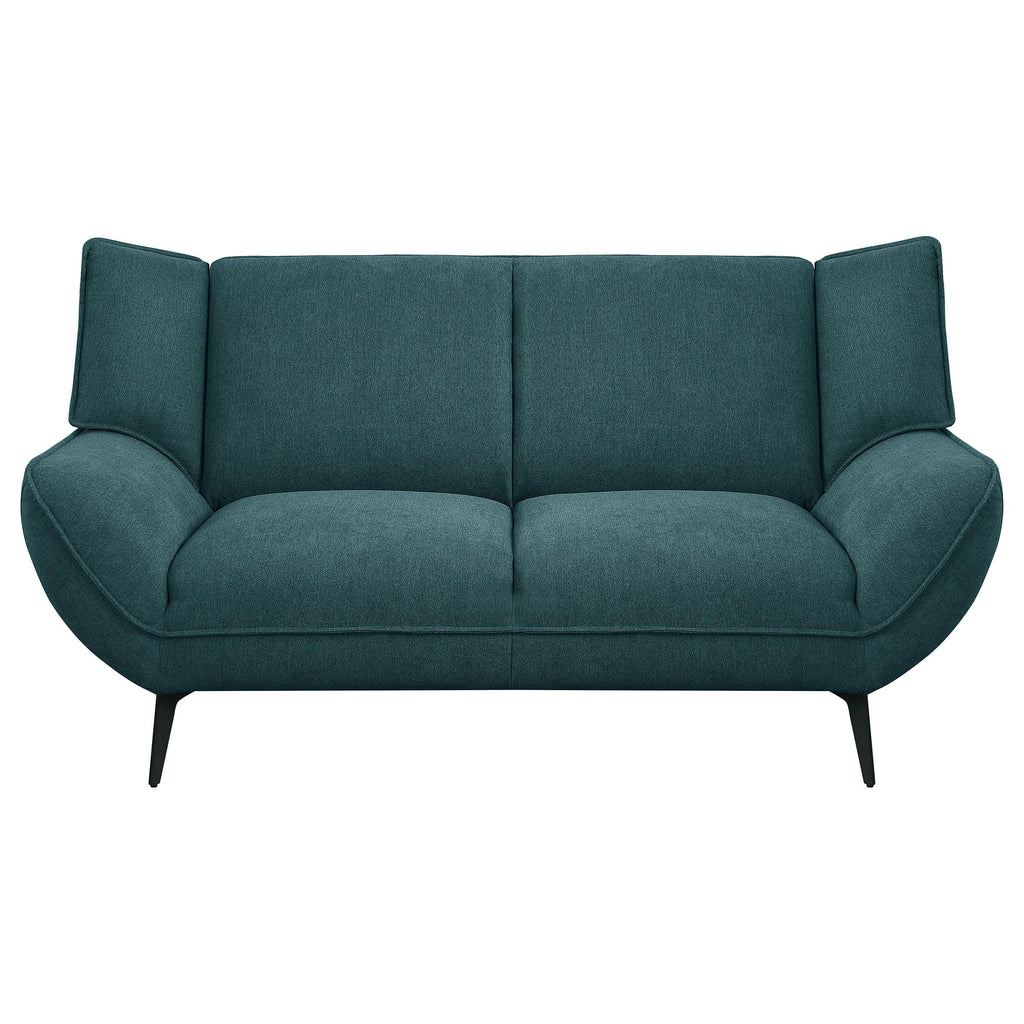 • Teal fabric upholstery with flared arms and wing backs, non-removable seat and back cushions, and tapered black metal legs