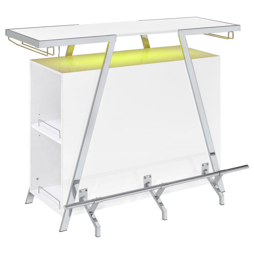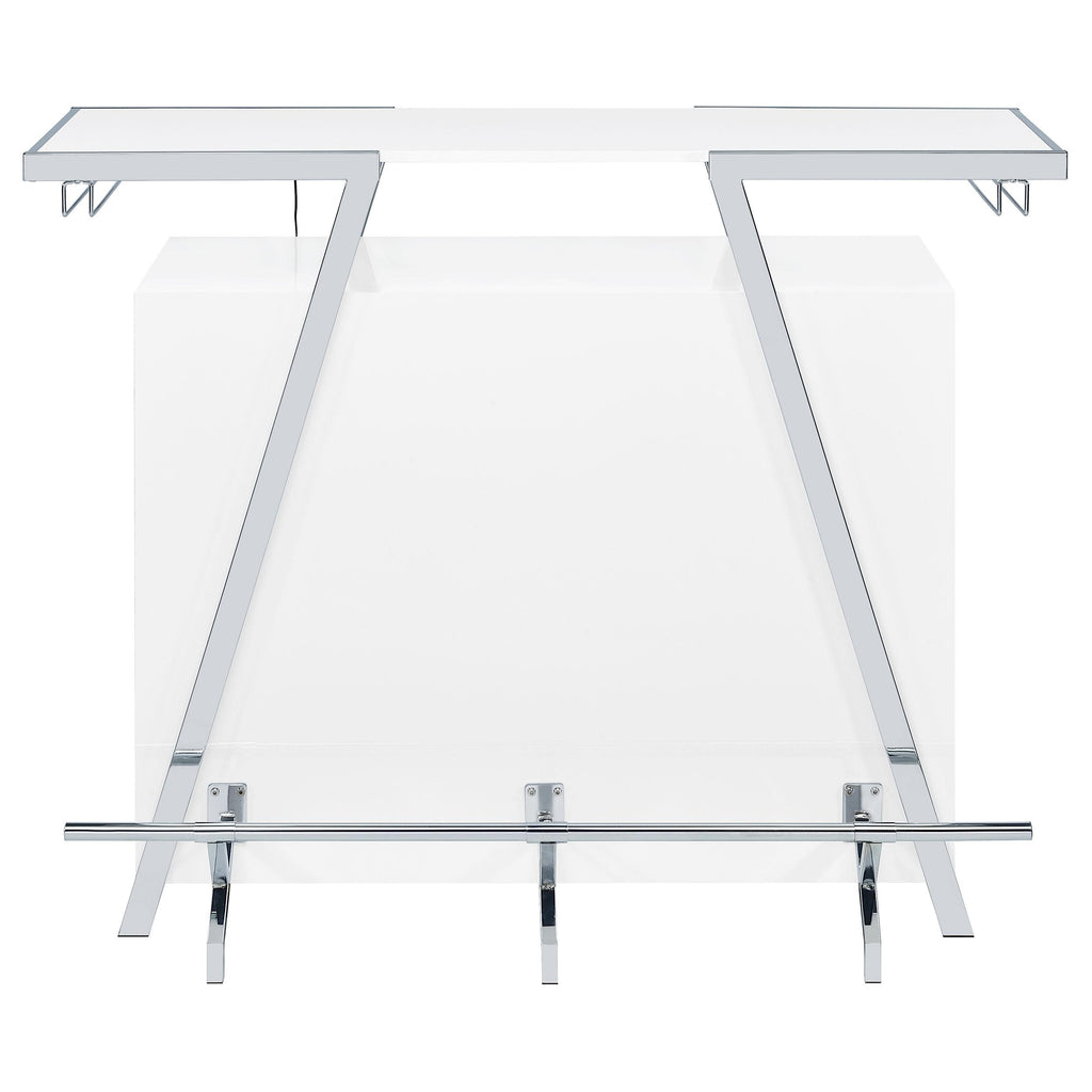 • Modular-inspired and contemporary home bar constructed of MDF, paper coating, and veneer with bright white finish and metal framing with geometric motif