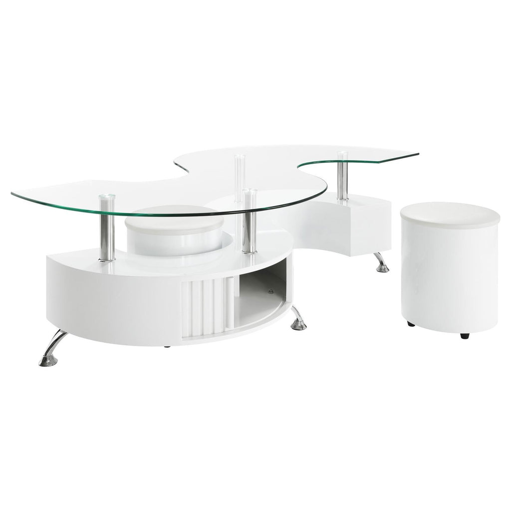 • Curved serpentine coffee table with clear tempered glass top and chrome accents