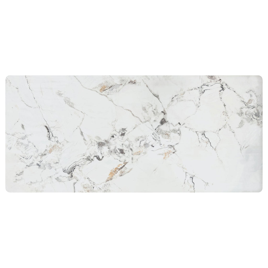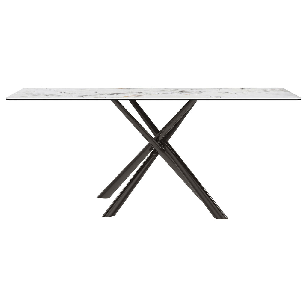 • Rectangular table top is made from durable sintered stone in a multi-tonal white mirage finish
