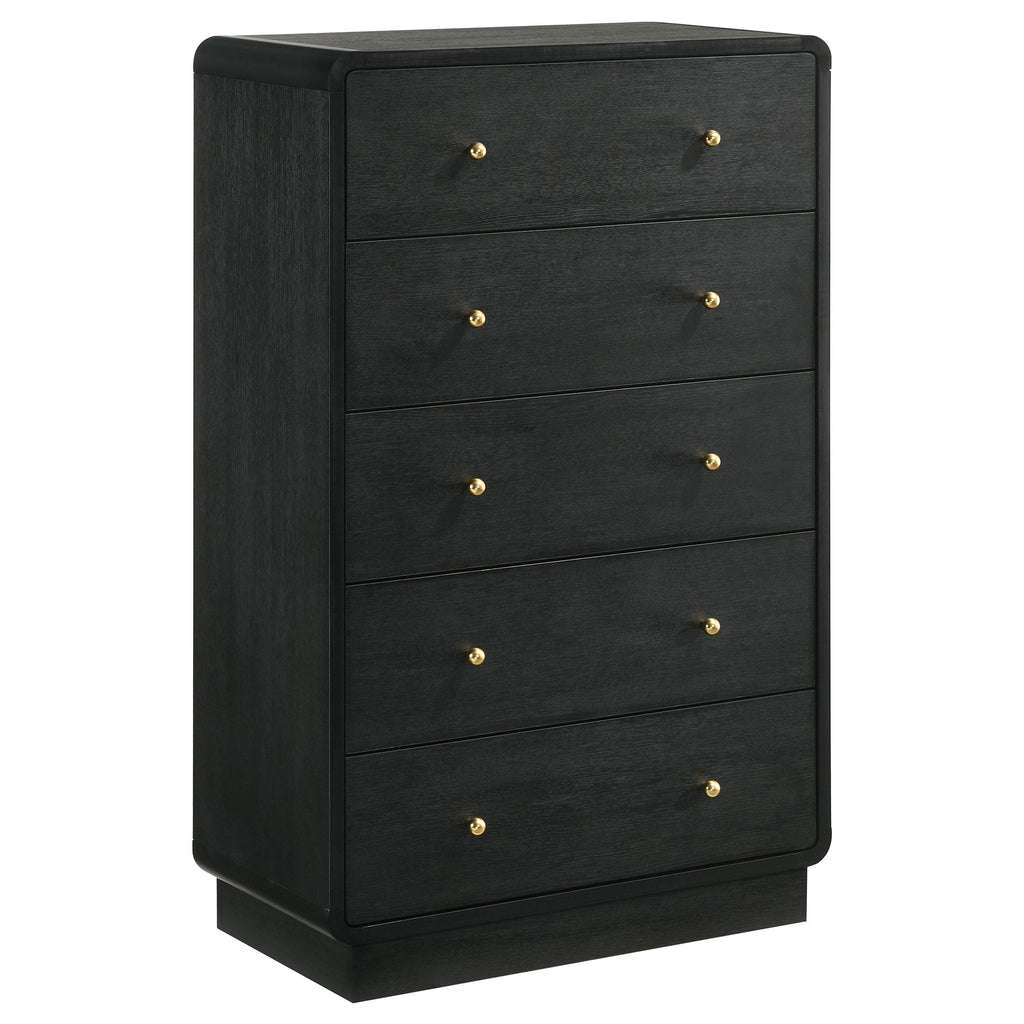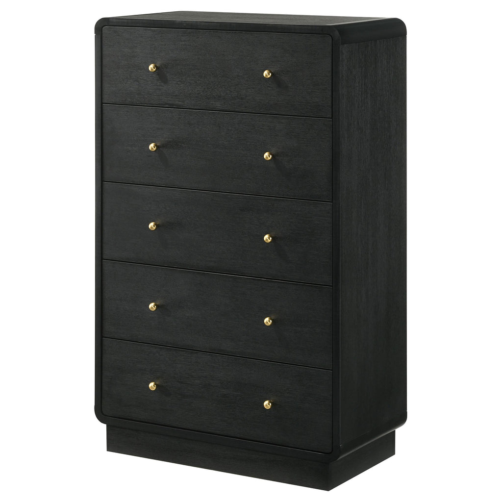 • A modern five-drawer chest provides plentiful bedroom storage and stylish allure