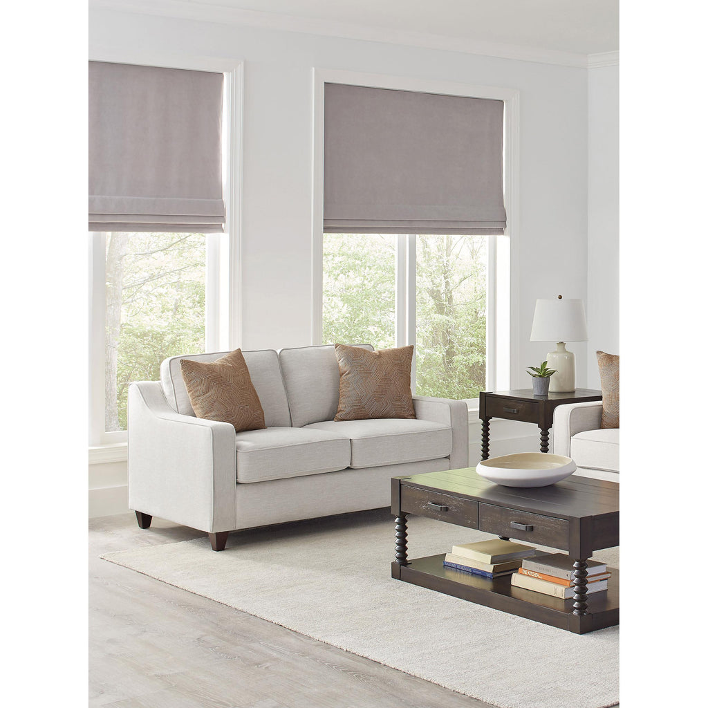 • Upholstered in soft low pile textured beige chenille and accessorized with subtle shades of copper and coral pillow accents