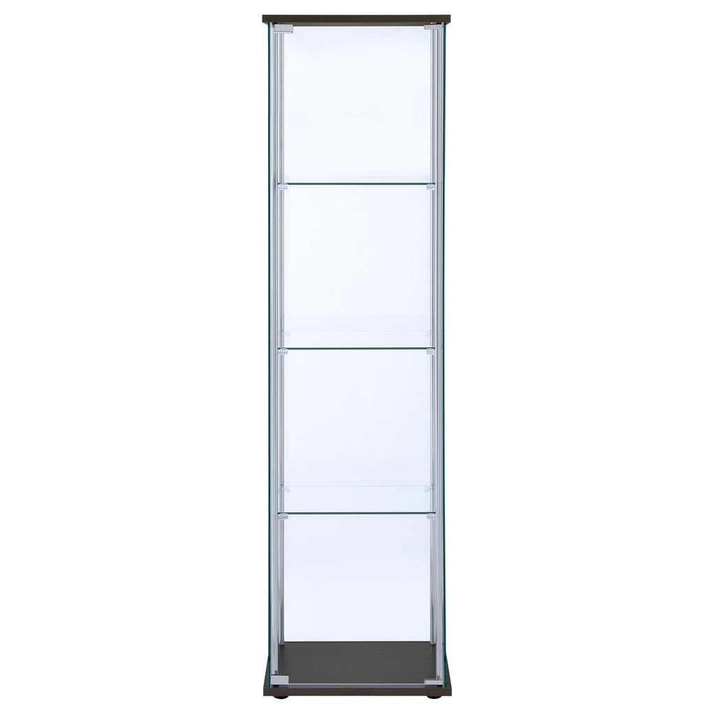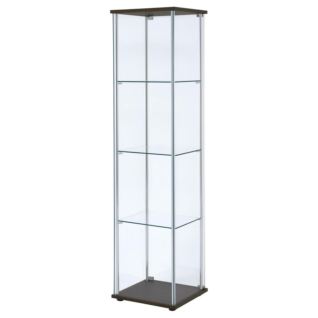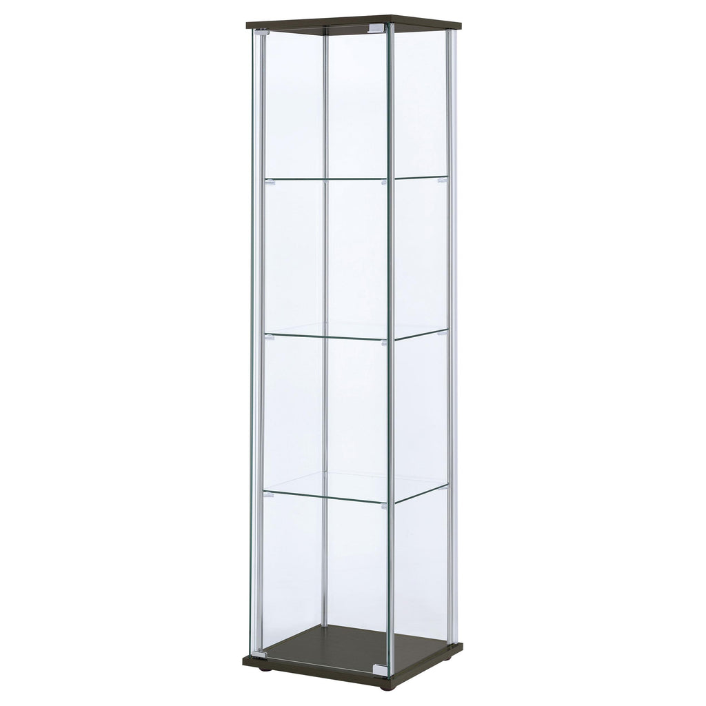 • Modern curio cabinet with rectangular top and base provides classic elegance