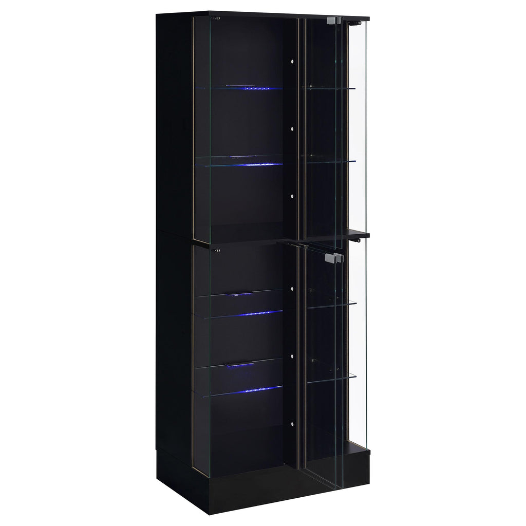 • Two-door design with six tiers of shelving for ample display space