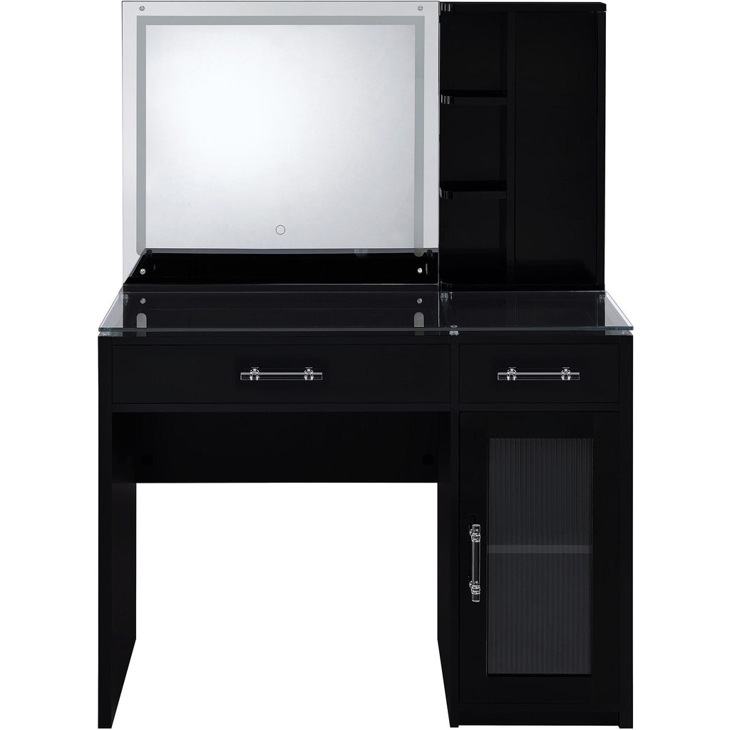 • Two drawers and a cabinet with a framed fluted panel for organized storage