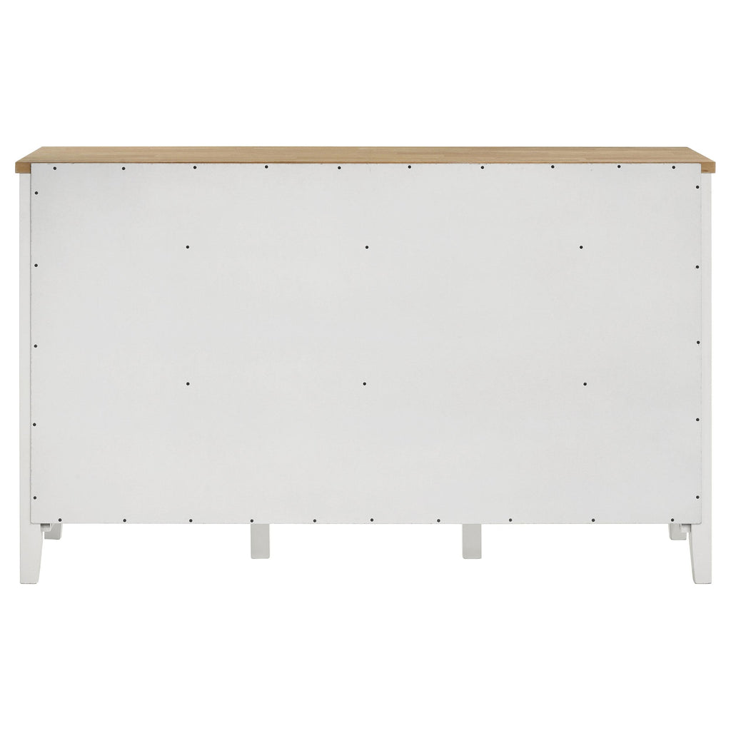 • Wire brushing adds rustic distressing to a modern farmhouse sideboard with two-tone look and natural wood top and crisp white base