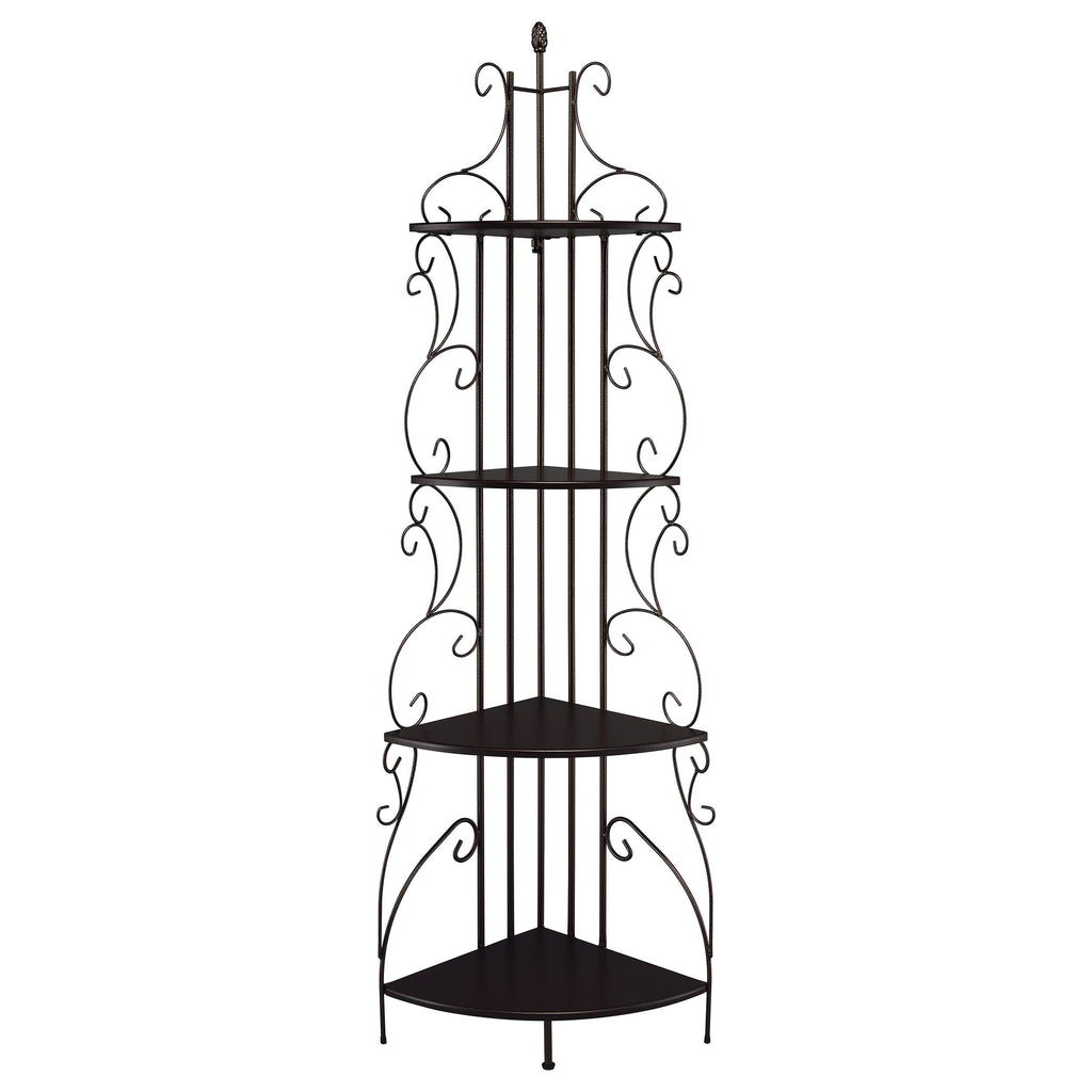 • Corner bookcase features warm cappuccino finish