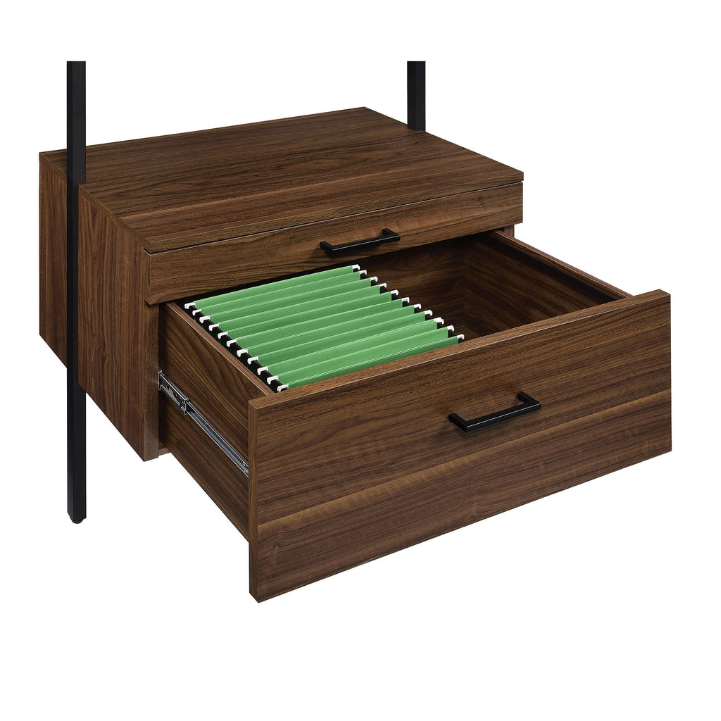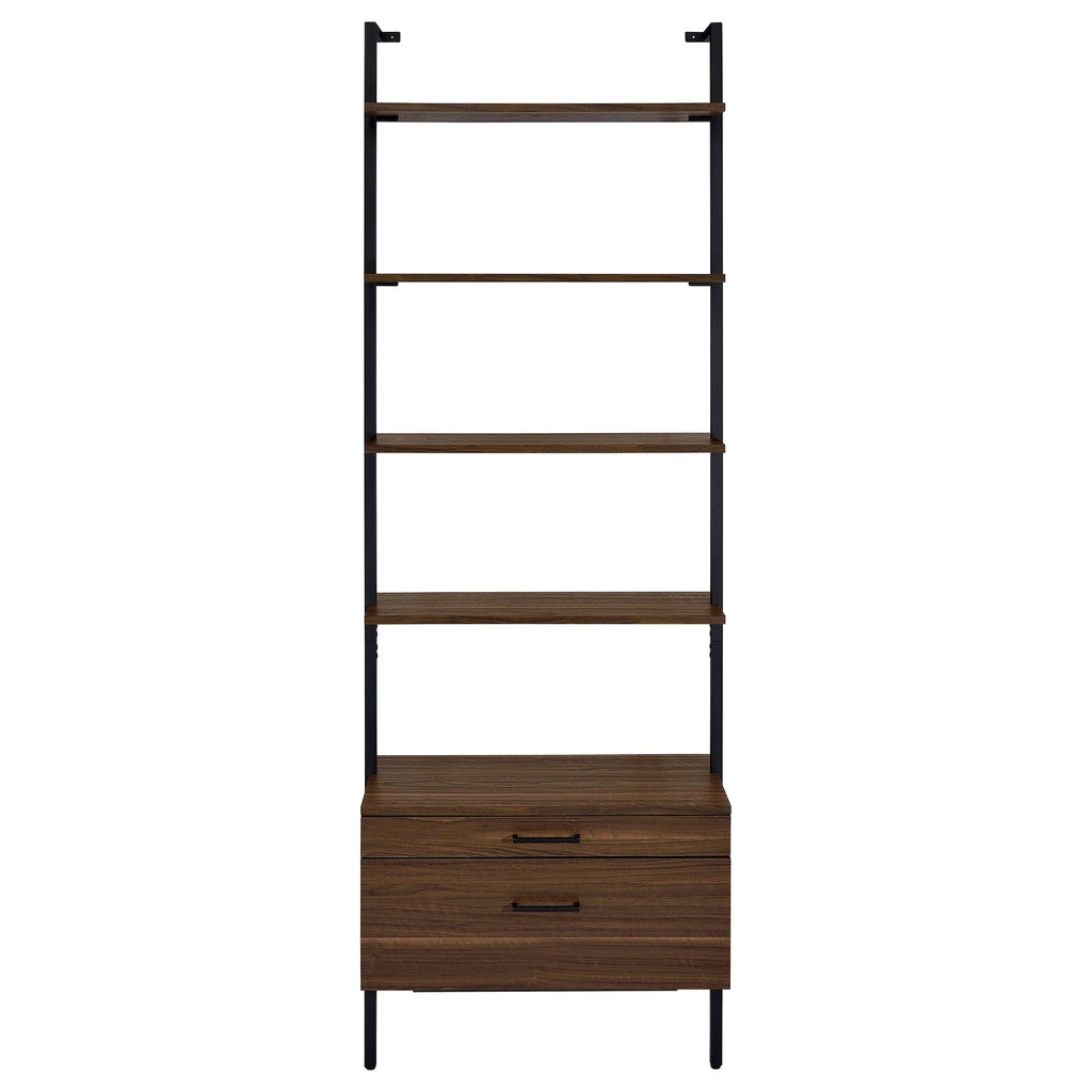 Play up the light, airy ambiance of a modern space while making use of every inch with a modern wall... Play up the light, airy ambiance of a modern space while making use of every inch with a modern wall bookcase. It features four floating upper shelves and a lower case with two drawers, perfect for a blend of storage and display in any room. The shelves and two drawers feature a warm walnut finish over melamine paper, offering durability for a lovely look that lasts. A black finish metal frame supports the bookcase, offering neutral appeal in any setting. Stash essentials in the drawers while adding decor to shelves for a personal look and feel. View more