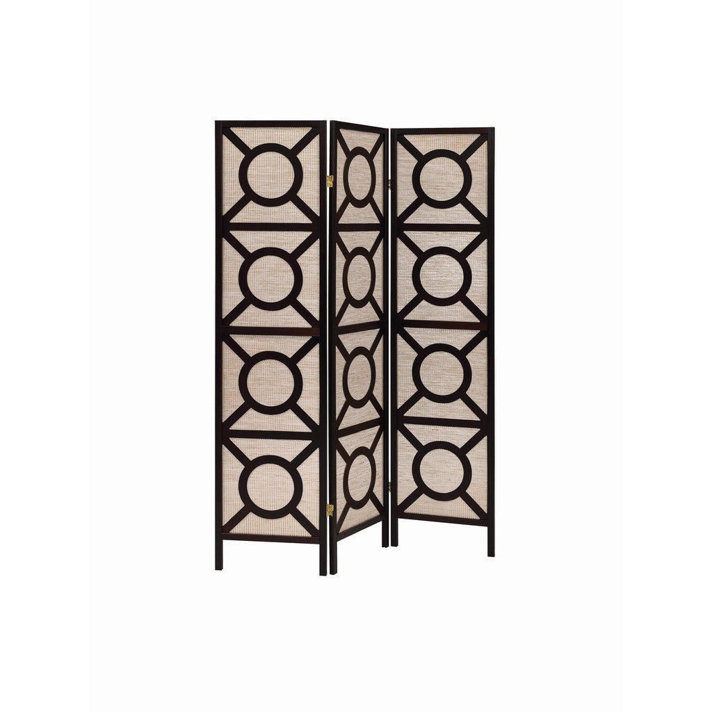 • Contemporary three panel screen with geometric design over translucent fabric panels