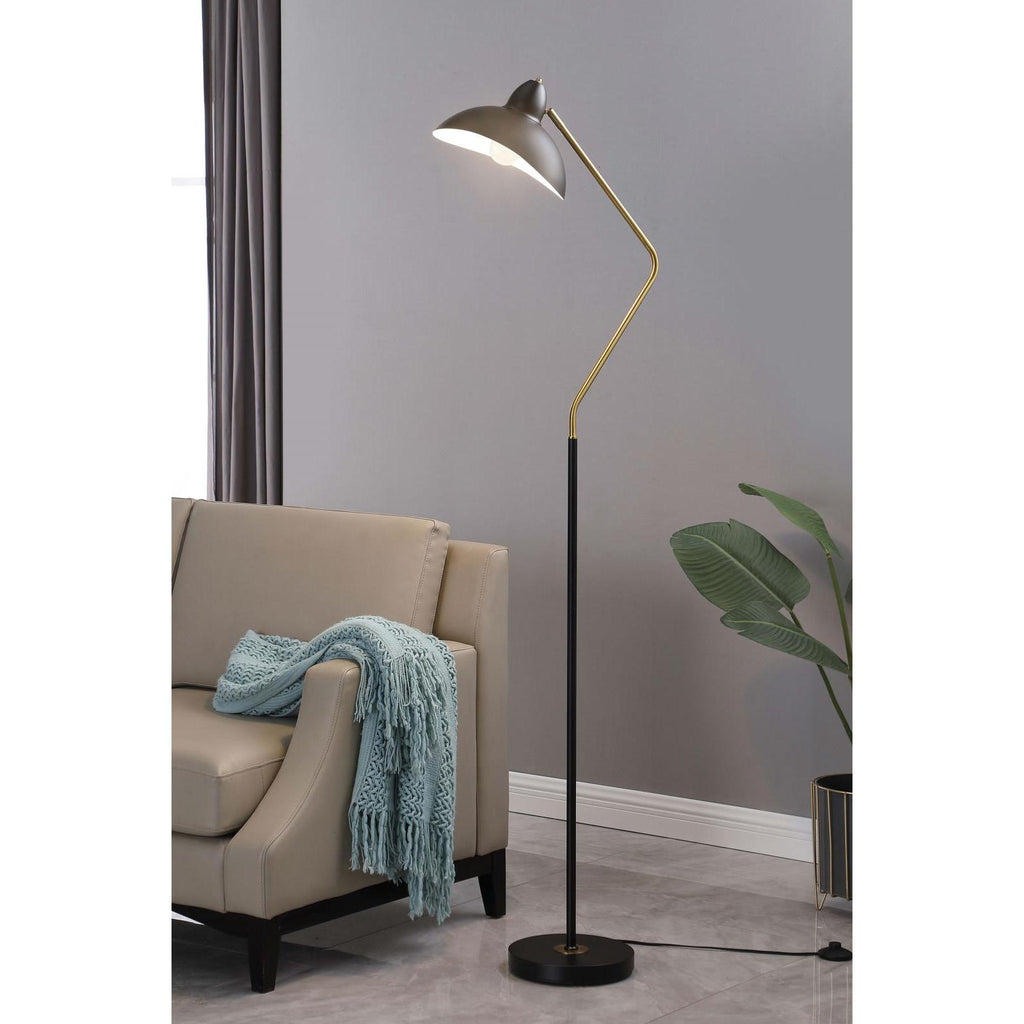 A contemporary floor lamp takes a classic mid-century inspired profile and updates it with modern flair. In black and gold,... A contemporary floor lamp takes a classic mid-century inspired profile and updates it with modern flair. In black and gold, the lamp boasts a slim post with a V-curved arm that ensures bright downlighting perfect for an armchair or desk. A black metal shade completes the look with a wavy edge and a bright white interior for true lighting. The shade easily adjusts to focus illumination just where you need it. A round base is chic and understated, while a foot switch on the cord makes for seamless operation. View more