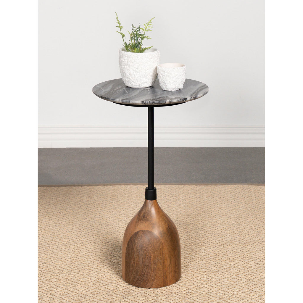 • Inverted goblet base with slim metal stem and warm brown mango wood cup