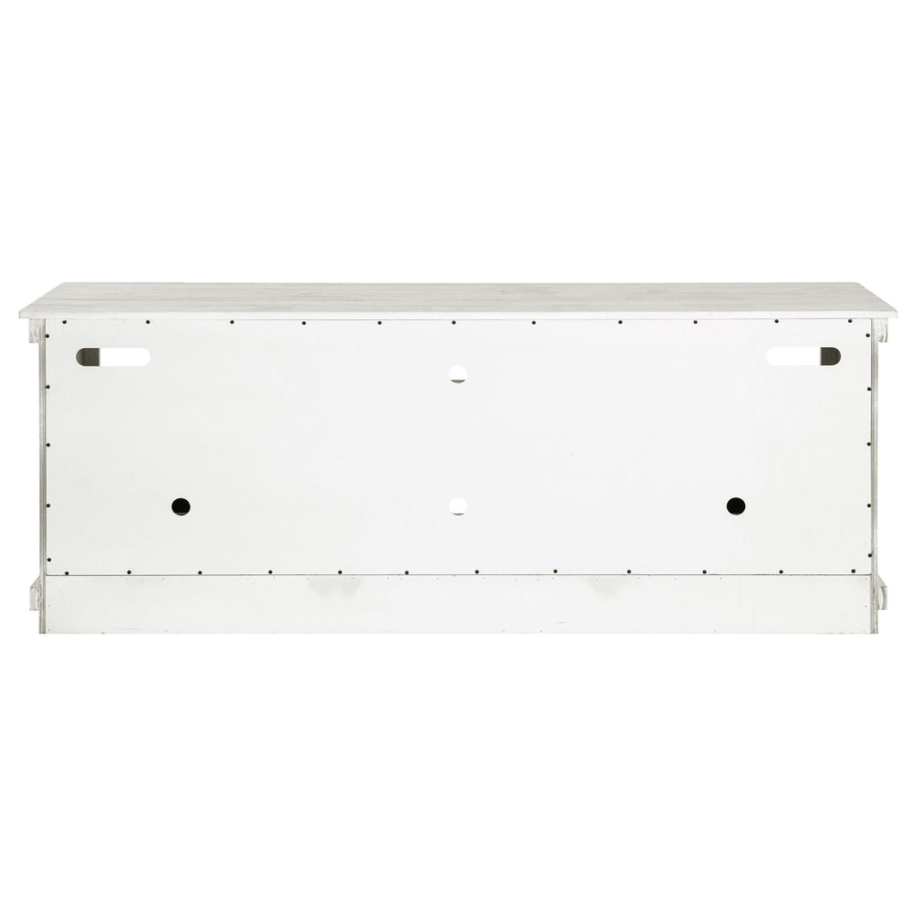 • Roughhewn wood markings add artisan character to a modern farmhouse TV stand