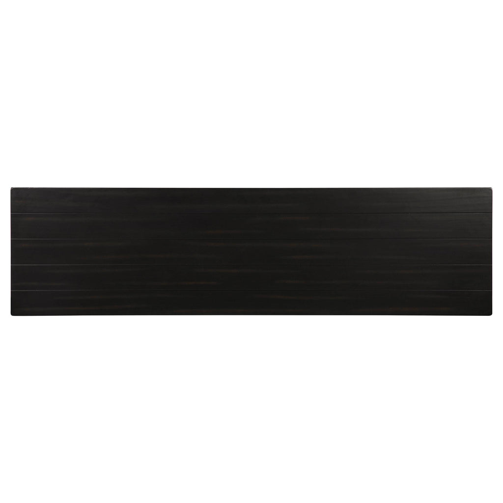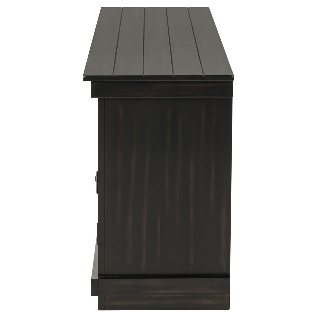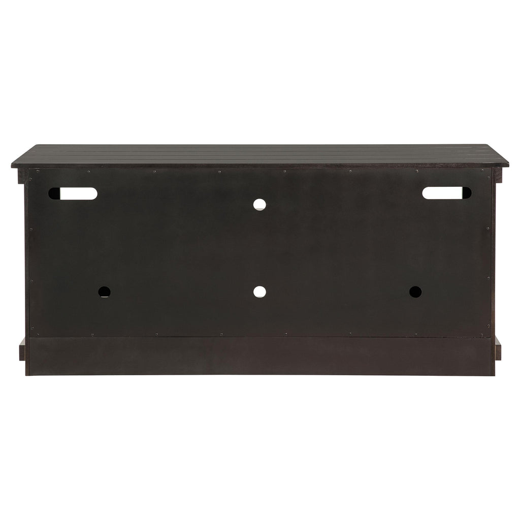 • Roughhewn wood markings add artisan character to a modern farmhouse TV stand