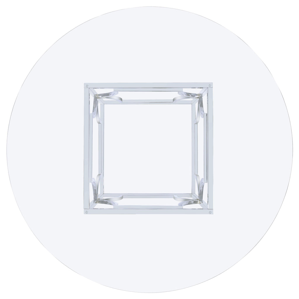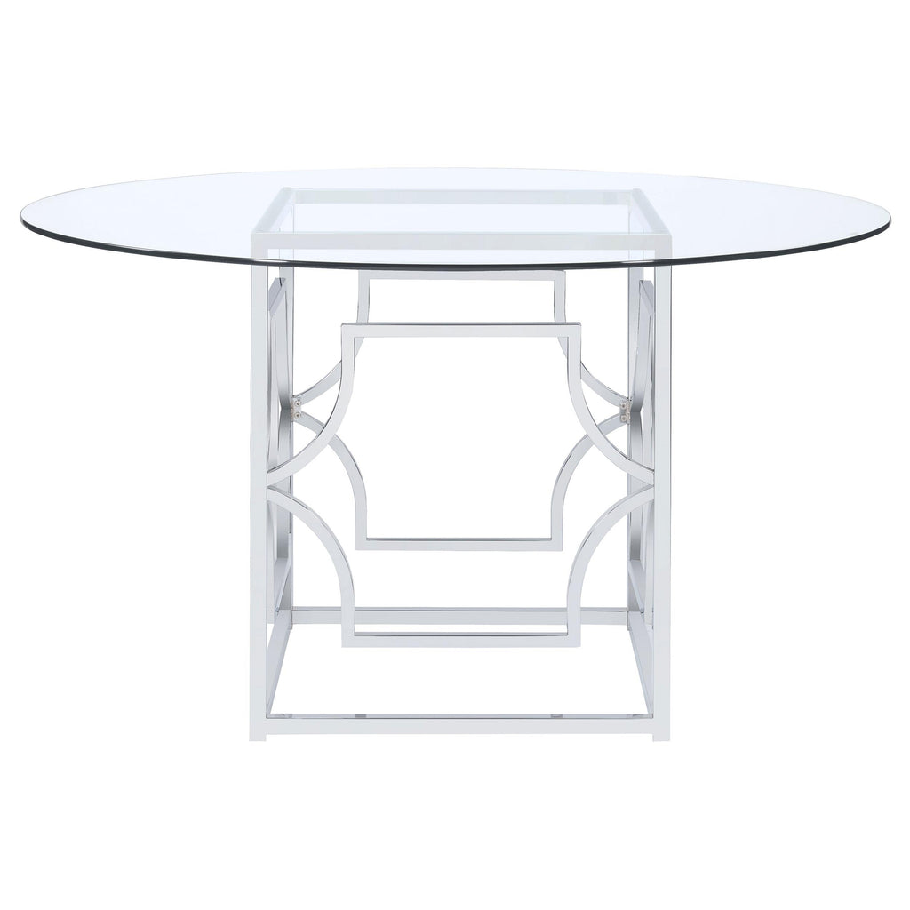• 54" round clear tempered glass top and stylish patterned base in polished chrome finish