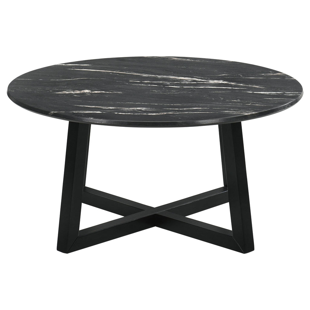 • Round coffee table with a sleek black marble-like laminate top