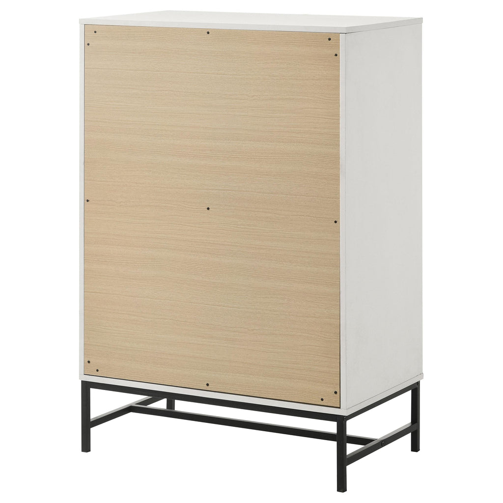 • A modern four-drawer chest features a sleek silhouettes and bold contrasting elements
