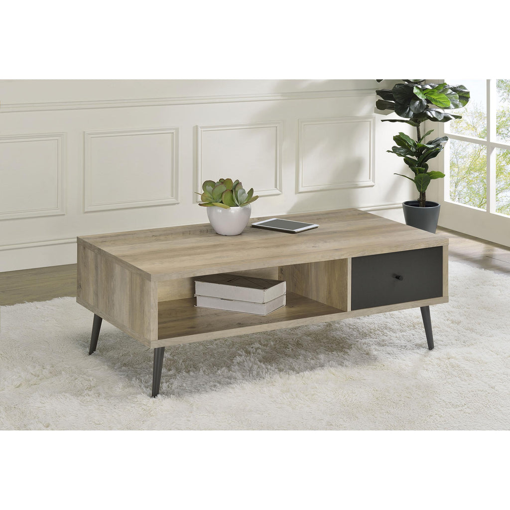 • Coffee table with distressed pine wood-look finish and engineered wood construction