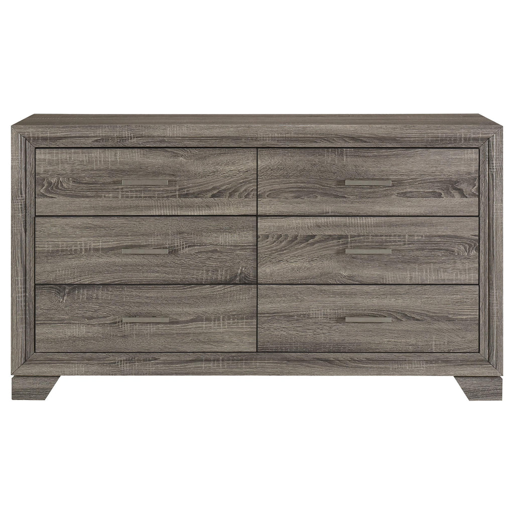 • Crisp style enhances the clean lines of a transitional six-drawer dresser with a wide top for decor