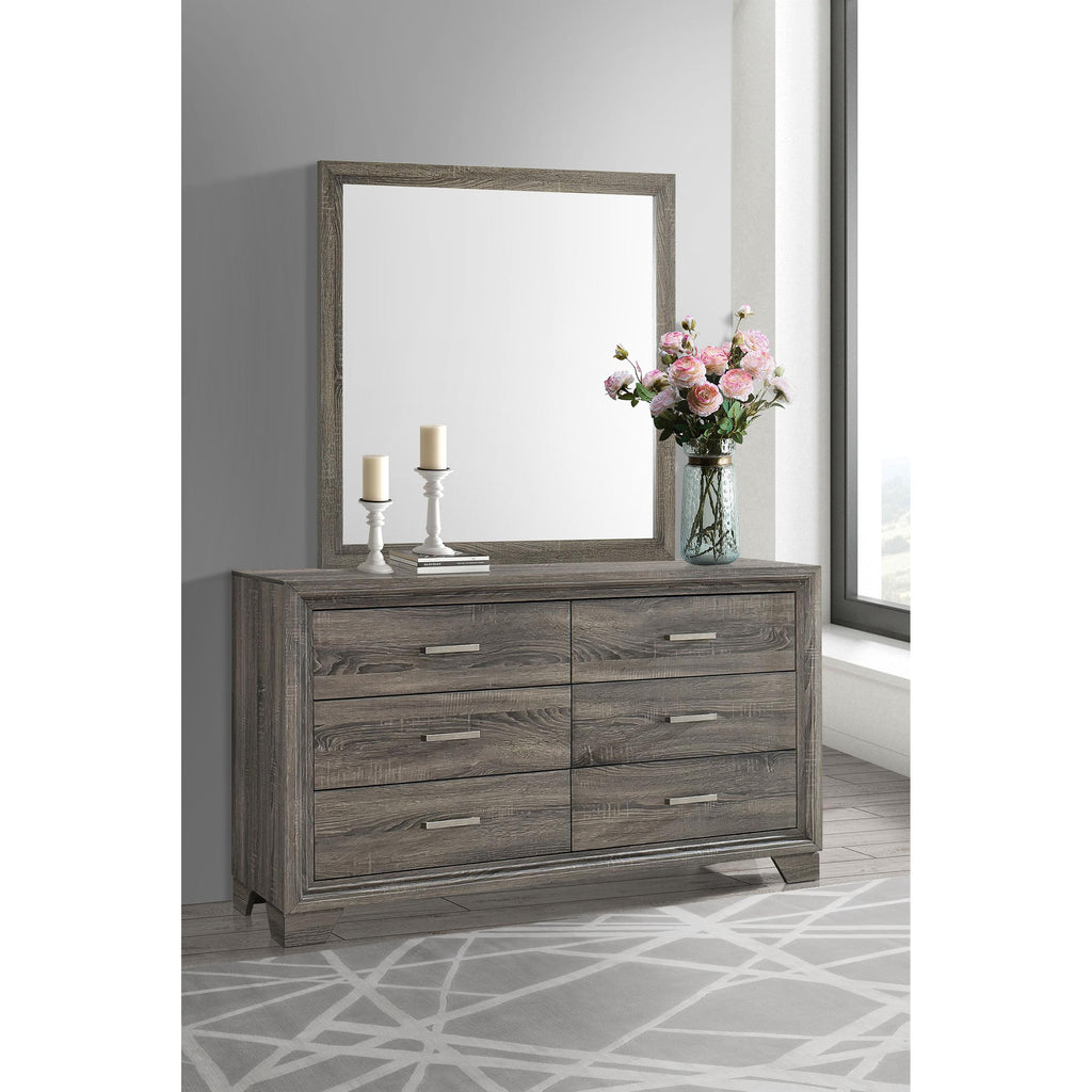 • Crisp style enhances the clean lines of a transitional six-drawer dresser with a framed mirror