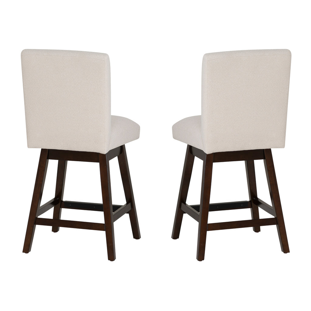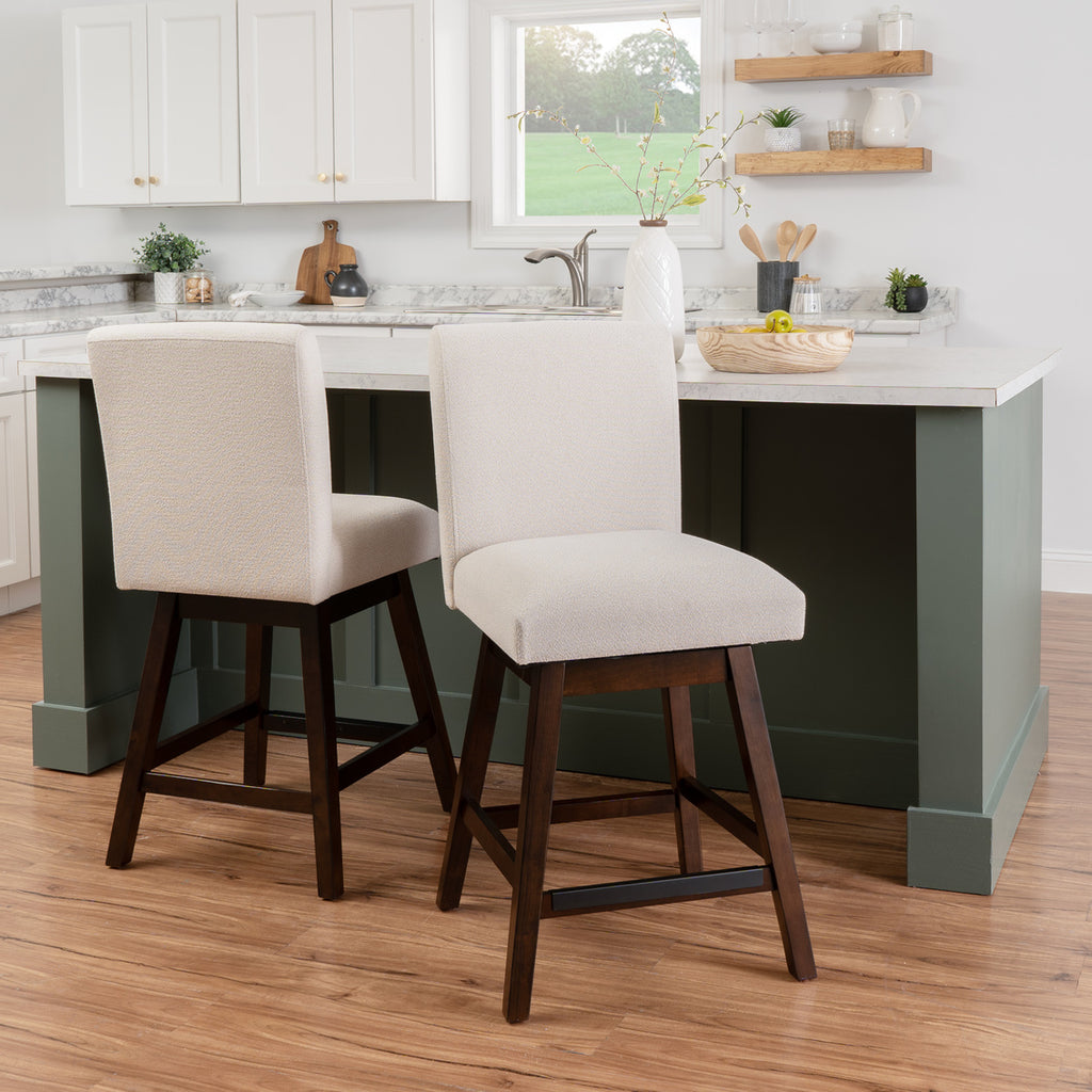 Add timeless charm to your dining or kitchen space with this set of two counter stools. Crafted from durable rubberwood... Add timeless charm to your dining or kitchen space with this set of two counter stools. Crafted from durable rubberwood with a rich brown lacquer finish, these stools feature a solid backrest and a built-in footrest for lasting support and comfort. The seat is upholstered in a natural woven fabric, adding a touch of texture and an earthy, neutral tone to your decor. With a smooth 180-degree swivel, these stools are perfect for casual meals, entertaining, or gathering at the counter. Measuring 19.5" L x 22.5" D x 41" H, they’re designed for counters 35” to 39” high and assemble easily, making them both stylish and practical. View more