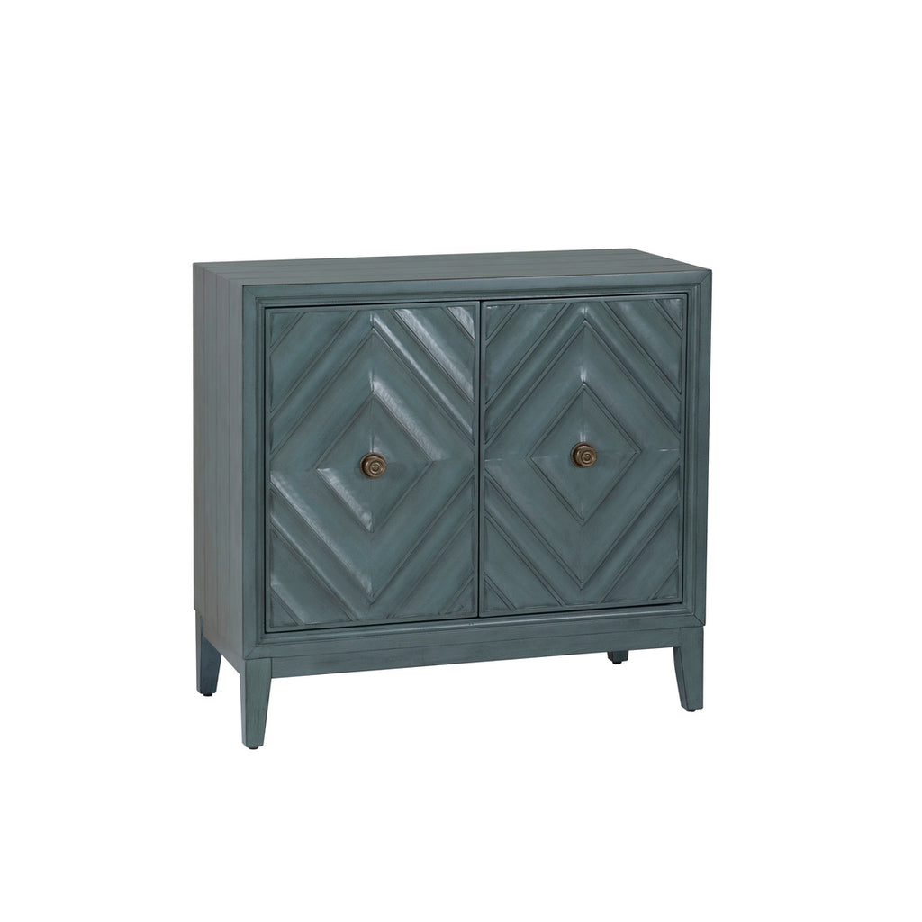 Bring a splash of style to any room with this stunning two-door cabinet. Finished in a vibrant blue lacquer, the... Bring a splash of style to any room with this stunning two-door cabinet. Finished in a vibrant blue lacquer, the eye-catching diamond design on the front adds a playful yet sophisticated touch. Crafted from durable MDF and Pine, this piece offers both beauty and function, with a weight capacity of 110 lbs on top and 50 lbs for each interior shelf. Assembly is a breeze—just attach the legs! Perfect for storing everyday essentials or showcasing decor, this accent table is designed to impress while blending seamlessly into your home. View more