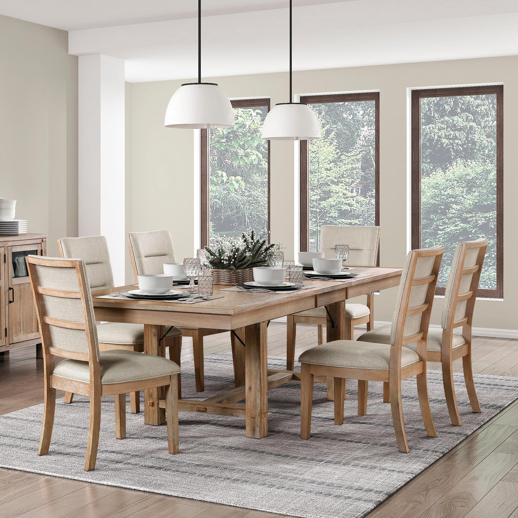 Expanding to fit the needs of your space, the Aberdeen Collection’s rustic aesthetic presents a welcoming look to your home’s... Expanding to fit the needs of your space, the Aberdeen Collection’s rustic aesthetic presents a welcoming look to your home’s casual dining room. The rustic look of the collection’s acacia veneer is enhanced with a wire-brushed light oak finish, the subtle hue lending an unexpectedly vibrant air to the look of the collection. A self-storing leaf allows for the tabletop’s expansion, creating extra space for family and friends. The side chair’s beige upholstered fabric seating features a ladderback wood frame. This set includes a dining table and 6 side chairs. View more