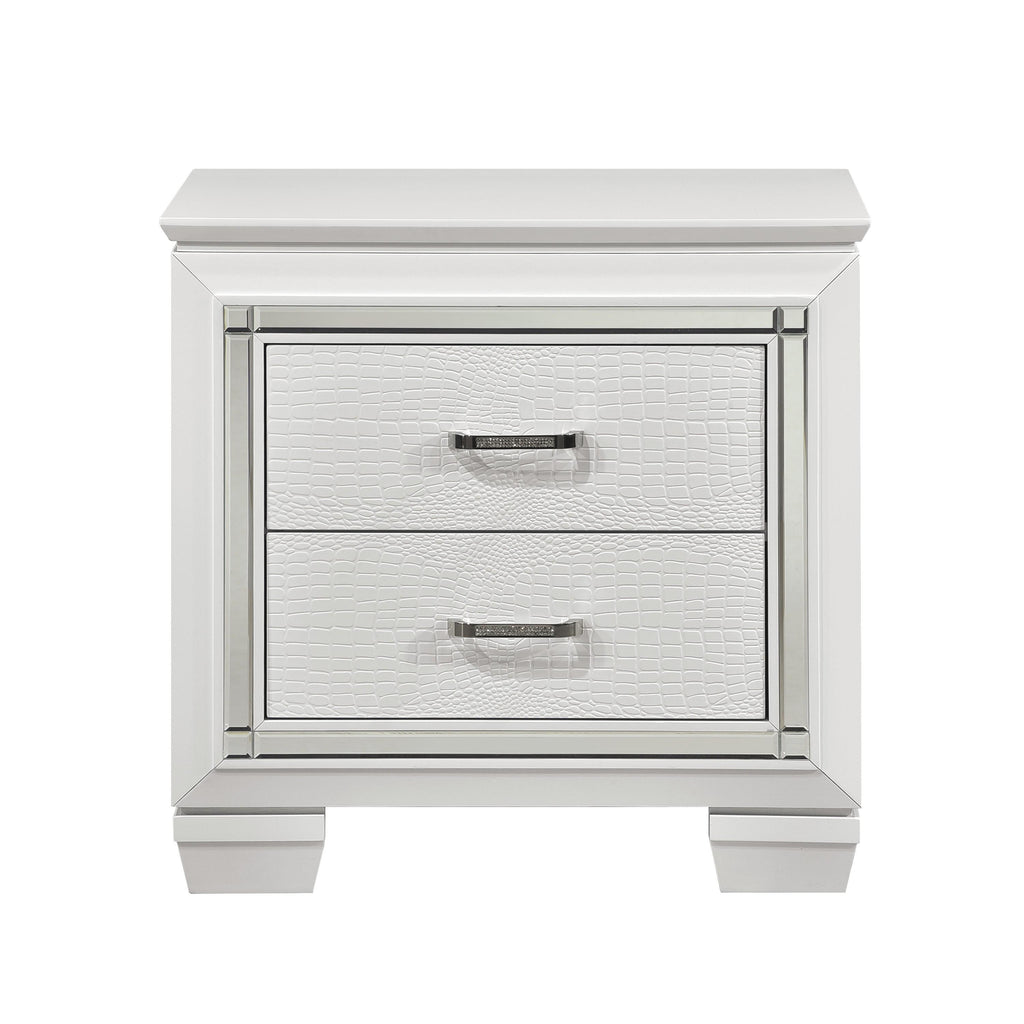 • Faux alligator embossed, textural drawer fronts with beveled mirror trim