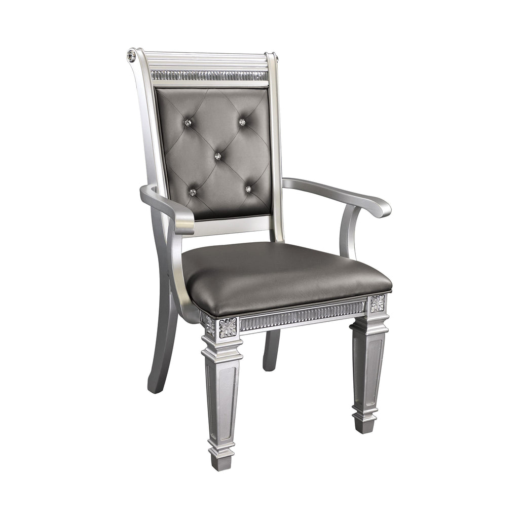 Modern glamour is exemplified in the design of the Bevelle Collection. Acrylic crystals frame each piece in the collection, reflecting... Modern glamour is exemplified in the design of the Bevelle Collection. Acrylic crystals frame each piece in the collection, reflecting the light to create eye-catching drama. The silver finish serves as the perfect complement to the high-polish decorative knob hardware of the china and server while medallion accents grace all pieces. Providing contrast to finish is the dark gray faux leather of the side chairs and arm chairs. This dining room set is composed of a rectangular dining table, four dining side chairs, and two arm chairs. View more
