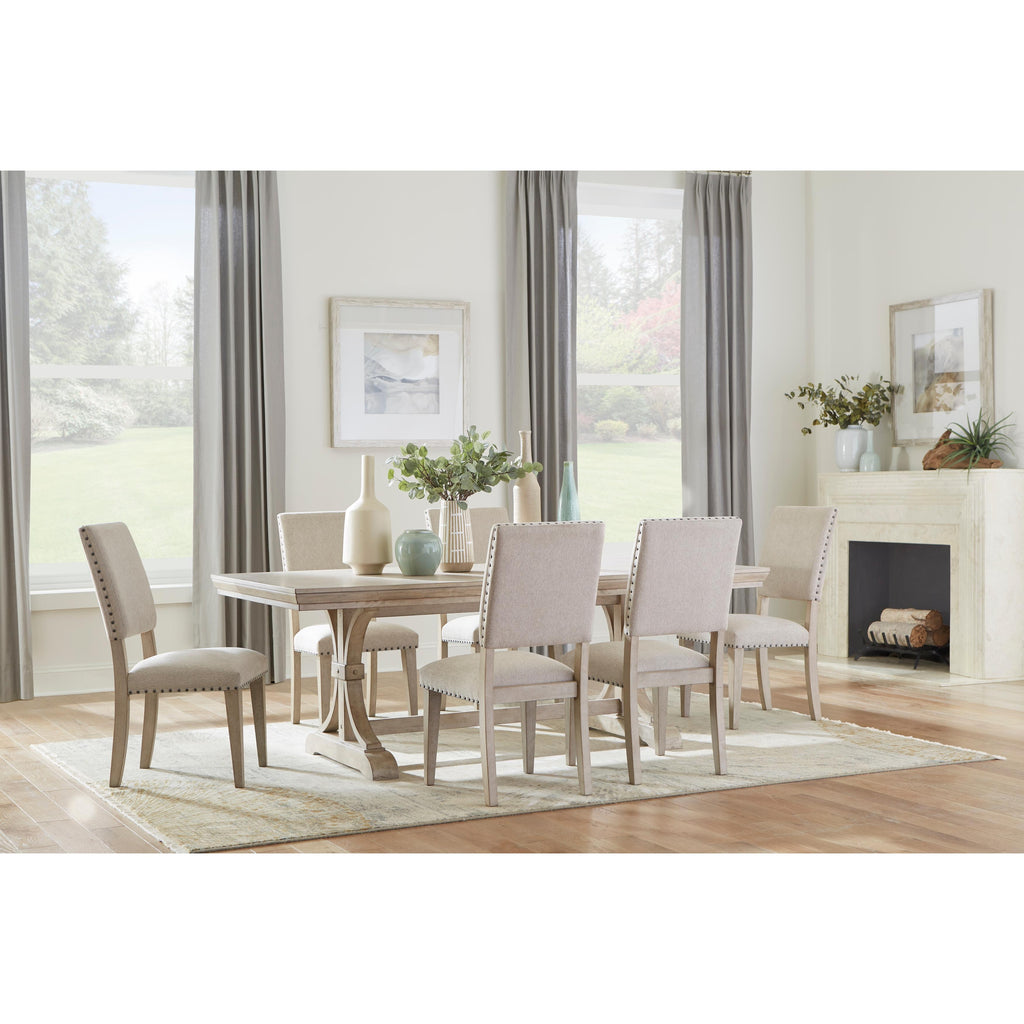 Rusticated elegance is exemplified in the design of the Fallon 7 pc dining set, presenting a classic aesthetic for your... Rusticated elegance is exemplified in the design of the Fallon 7 pc dining set, presenting a classic aesthetic for your casual dining space. From the angled and the routed edge of the table’s apron to the craftsman-inspired trestle base, each element blends effortlessly. The craftsman-inspired side chair's oak veneer features a weathered beige finish which highlights the natural look of the wood’s grain. The neutral tone of the side chairs' upholstered seats complements the collection’s finish. This set includes a dining table and 6 side chairs. View more