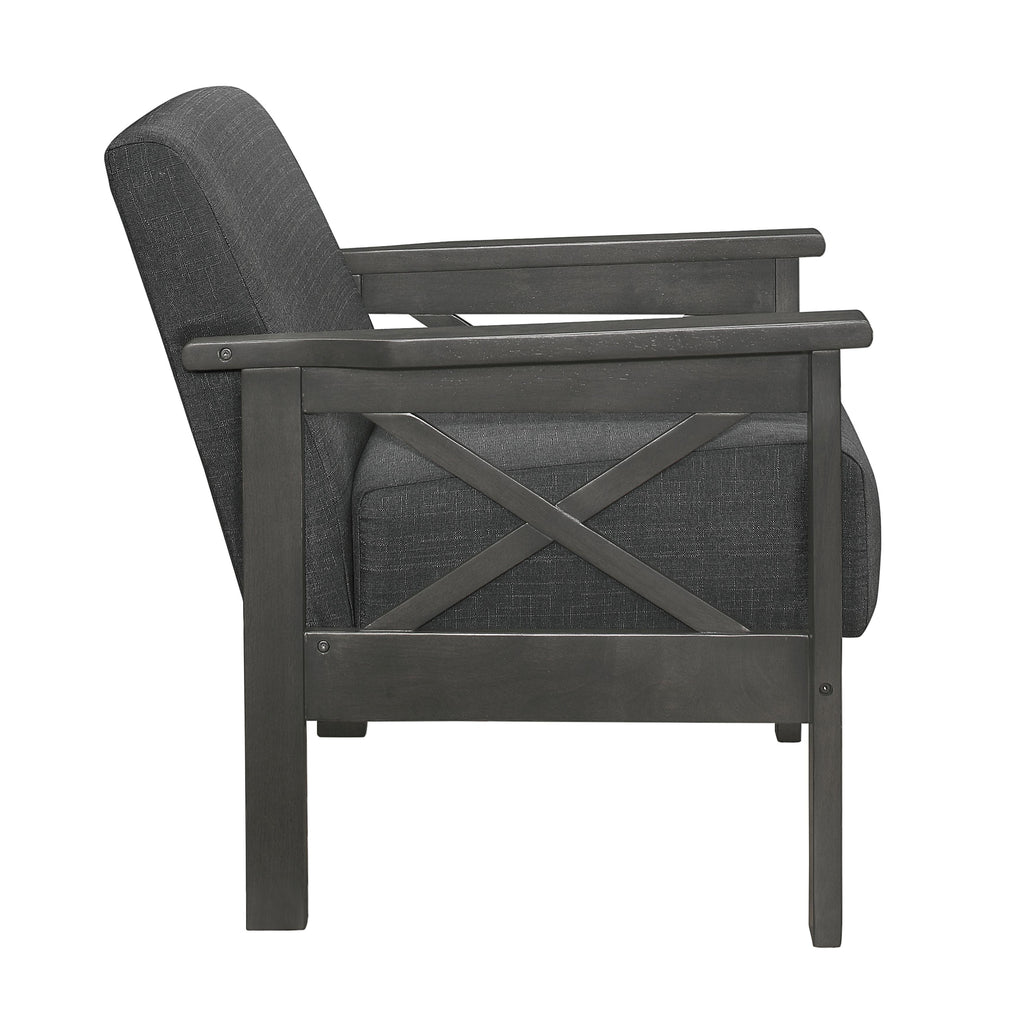 • Exposed wood frame with antique gray finish
