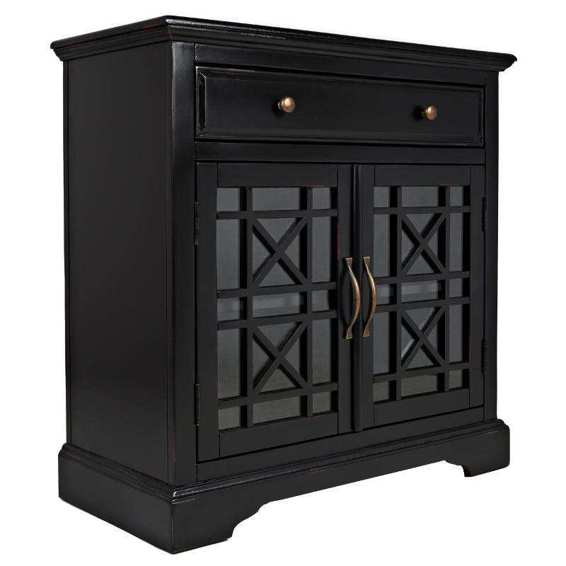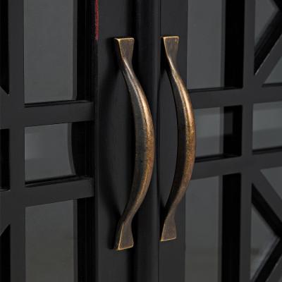 Beveled cabinet top and "X" motif detailing over the glass doors