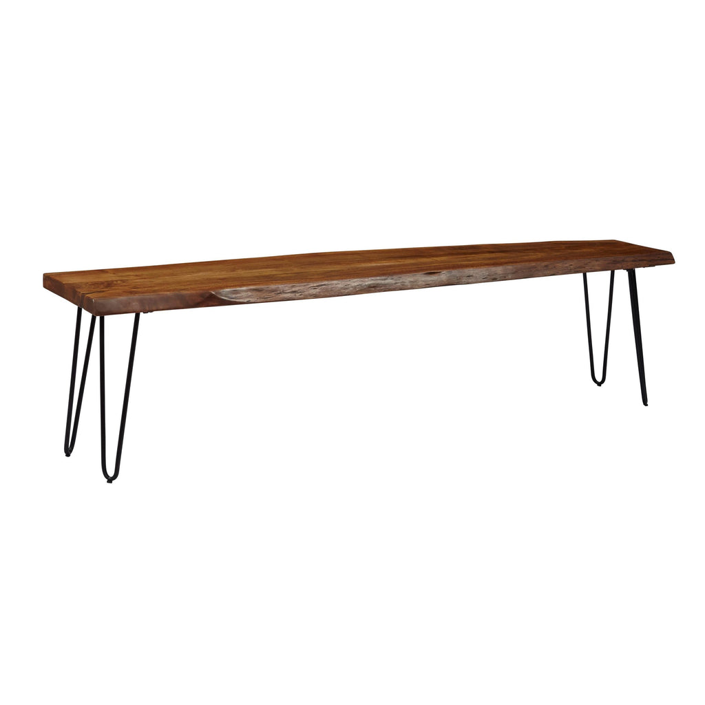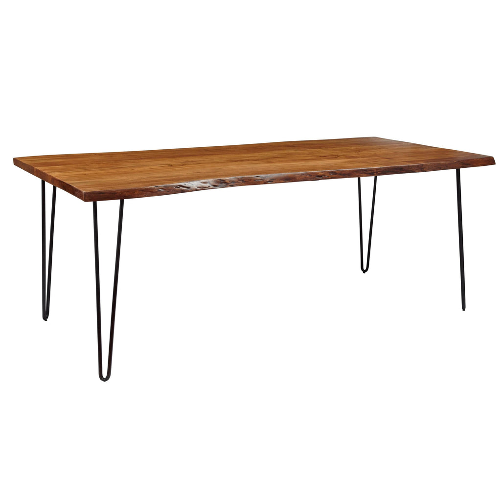 This Nature's Edge Dining Set is a true gem that captures the raw beauty of nature. Crafted from solid Acacia... This Nature's Edge Dining Set is a true gem that captures the raw beauty of nature. Crafted from solid Acacia wood, each piece boasts a live edge that highlights the unique curves of the tree. The combination of modern and rustic elements is expertly executed in the sleek silhouette with hairpin legs. Every piece is distinct, showcasing the wood's natural imperfections like knots and cracks. This set includes one dining table, a bench and four side chairs. View more