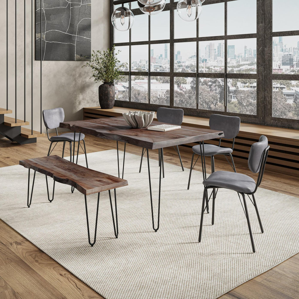 The Nature's Edge Dining Set is a true gem that captures the raw beauty of nature. Crafted from solid Acacia... The Nature's Edge Dining Set is a true gem that captures the raw beauty of nature. Crafted from solid Acacia wood, each piece in this set boasts a live edge that highlights the unique curves of the tree. The combination of modern and rustic elements is expertly executed in the sleek silhouette with hairpin legs. This set includes one dining table, a bench and four side chairs. View more