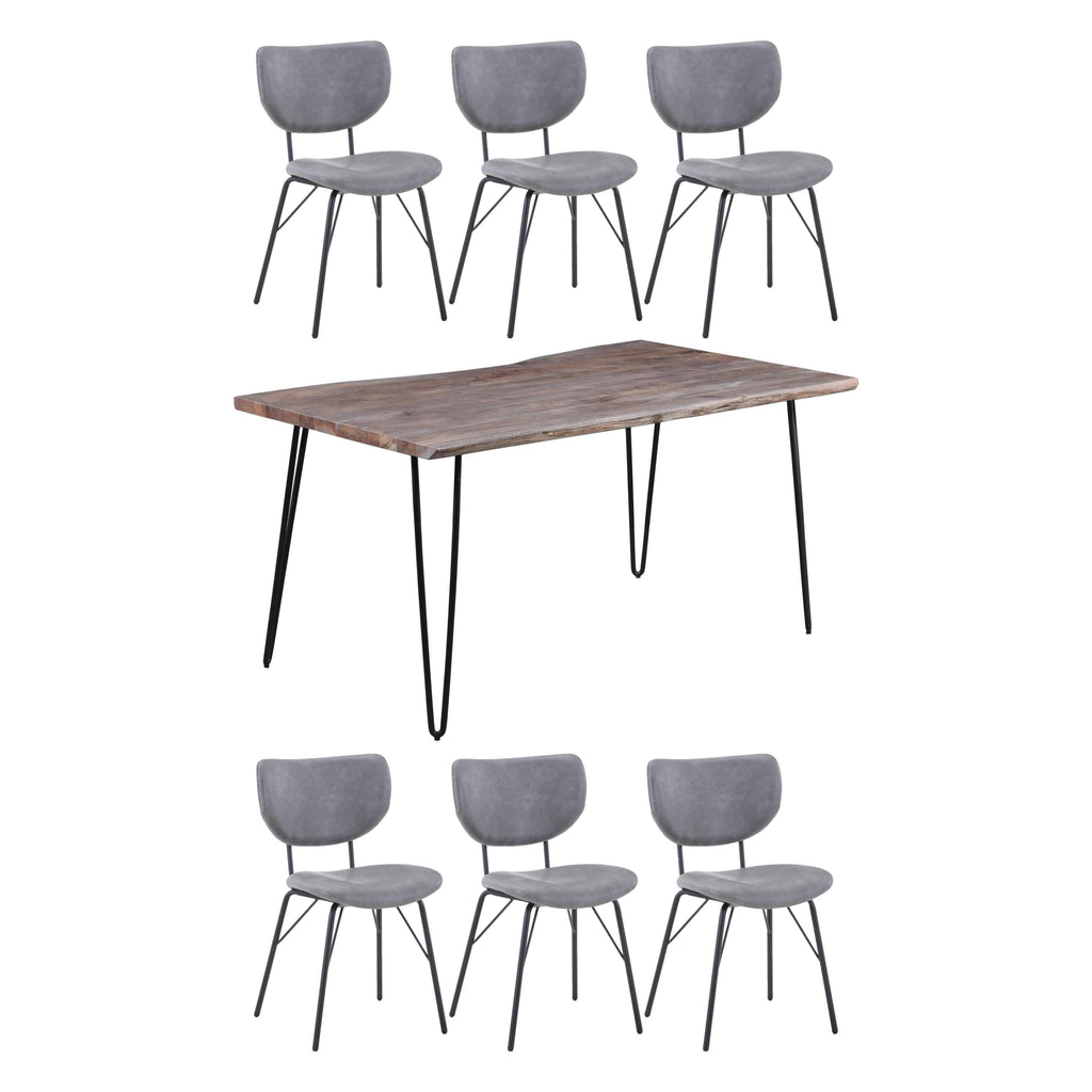 The Nature's Edge Dining Set is a true gem that captures the raw beauty of nature. Crafted from solid Acacia... The Nature's Edge Dining Set is a true gem that captures the raw beauty of nature. Crafted from solid Acacia wood, each piece in this set boasts a live edge that highlights the unique curves of the tree. The combination of modern and rustic elements is expertly executed in the sleek silhouette with hairpin legs. This set includes one dining table and six side chairs. View more