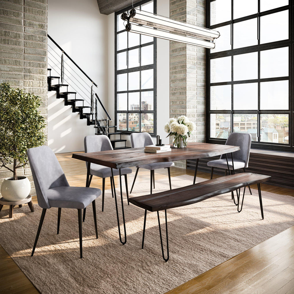 This Nature's Edge Dining Set is a true gem that captures the raw beauty of nature. Crafted from solid Acacia... This Nature's Edge Dining Set is a true gem that captures the raw beauty of nature. Crafted from solid Acacia wood, each piece boasts a live edge that highlights the unique curves of the tree. The combination of modern and rustic elements is expertly executed in the sleek silhouette with hairpin legs. Every piece is distinct, showcasing the wood's natural imperfections like knots and cracks. This set includes one dining table, a bench and four side chairs. View more