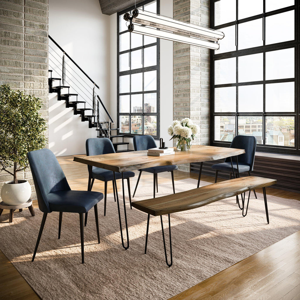 This Nature's Edge Dining Set is a true gem that captures the raw beauty of nature. Crafted from solid Acacia... This Nature's Edge Dining Set is a true gem that captures the raw beauty of nature. Crafted from solid Acacia wood, each piece boasts a live edge that highlights the unique curves of the tree. The combination of modern and rustic elements is expertly executed in the sleek silhouette with hairpin legs. Every piece is distinct, showcasing the wood's natural imperfections like knots and cracks. This set includes one dining table, a bench and four side chairs. View more