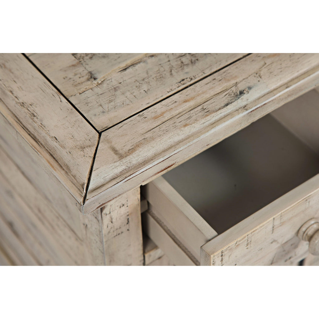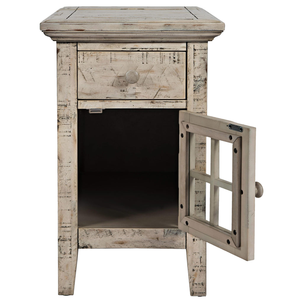 This Rustic Shores chairside table by Jofran features a relaxed vintage style with a wood top, a drawer, an open... This Rustic Shores chairside table by Jofran features a relaxed vintage style with a wood top, a drawer, an open door to keep magazines, books or anything at hand. View more