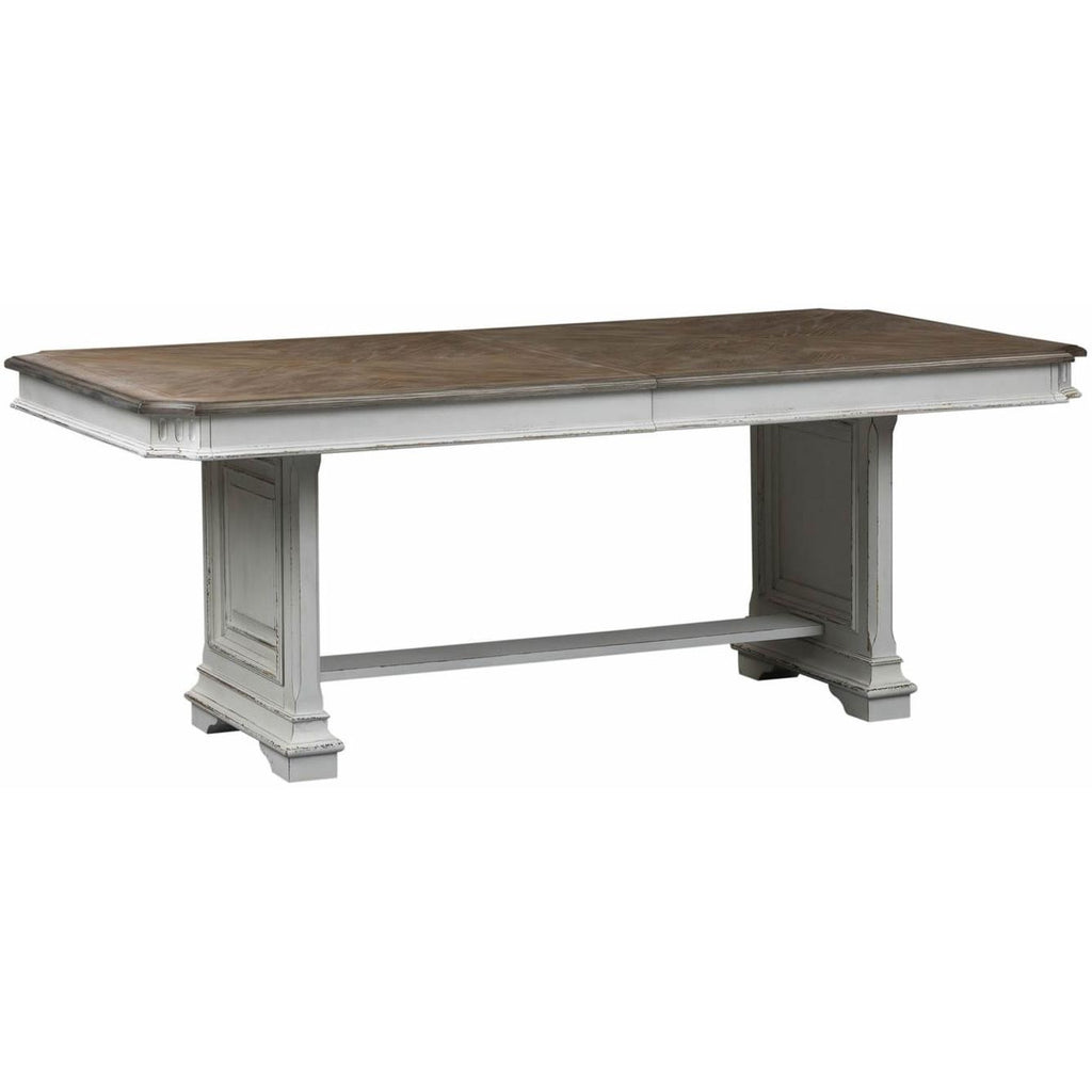 • A two-tone piece with a brown top and a distressed antique white finish