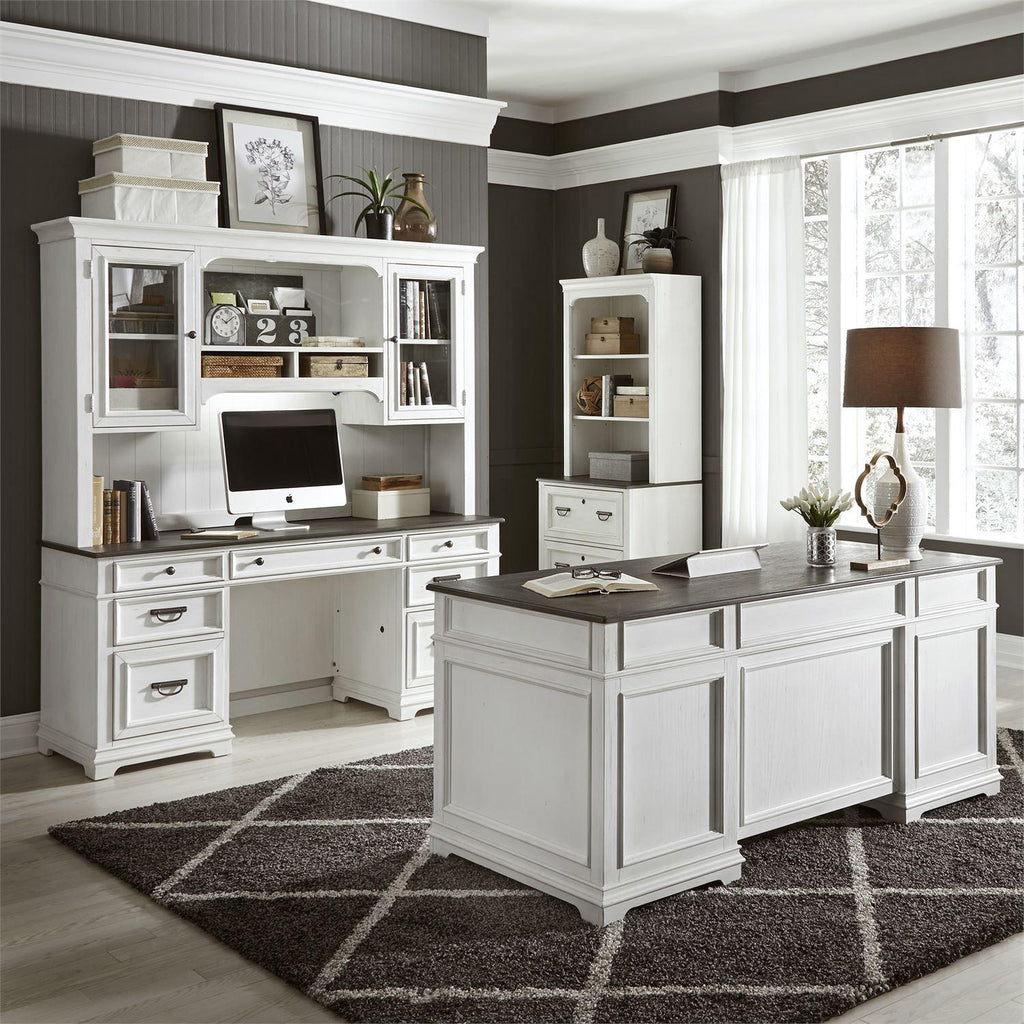 This Allyson Park Home Office Set from Liberty Furniture is made of Pine solids with Cathedral White Oak tops and... This Allyson Park Home Office Set from Liberty Furniture is made of Pine solids with Cathedral White Oak tops and Pine veneer fronts in a wire-brushed white finish. It features a relaxed vintage style adding a classic look with a casual feel to your home office. This set includes one Jr Executive desk, credenza and hutch. View more