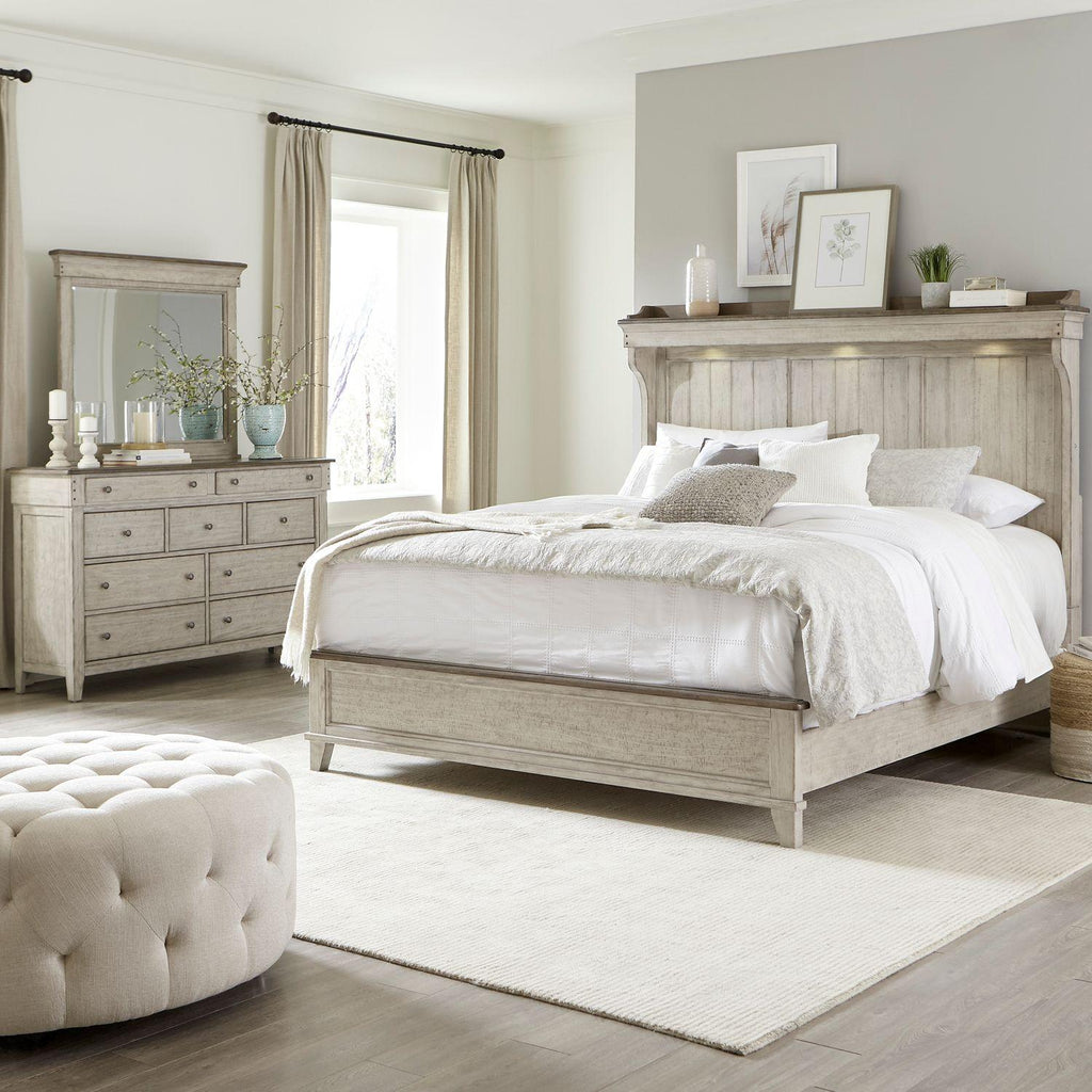 Create a relaxing retreat with the Ivy Hollow queen mantle bed, dresser, and mirror. Crafted of poplar solids with pine... Create a relaxing retreat with the Ivy Hollow queen mantle bed, dresser, and mirror. Crafted of poplar solids with pine and alder veneers, this kit features a heavily distressed weathered linen finish with saw marks and dusty taupe tops, full extension drawers with premium felt lined top and cedar lined bottom drawers, offset top drawers to create dimension, framed end panels, pin nail head accents, and antique pewter knob hardware. The mantle bed features a headboard with a shaped mantle crown and gallery top, with touch LED lighting illuminating planked panels. The panel footboard features a cap rail finished in dusty taupe that combines nicely with the weathered linen finish. The dresser has nine drawers of varying sizes for plenty of storage. Attach the landscape mirror with the included bolt-on supports that features a beveled edge. Inviting and inspirational, Ivy Hollow offers the farmhouse look and design style that works for cottage or contemporary and is more about creating a look that we love. This set includes one headboard, footboard and rails as well as one dresser with mirror. View more