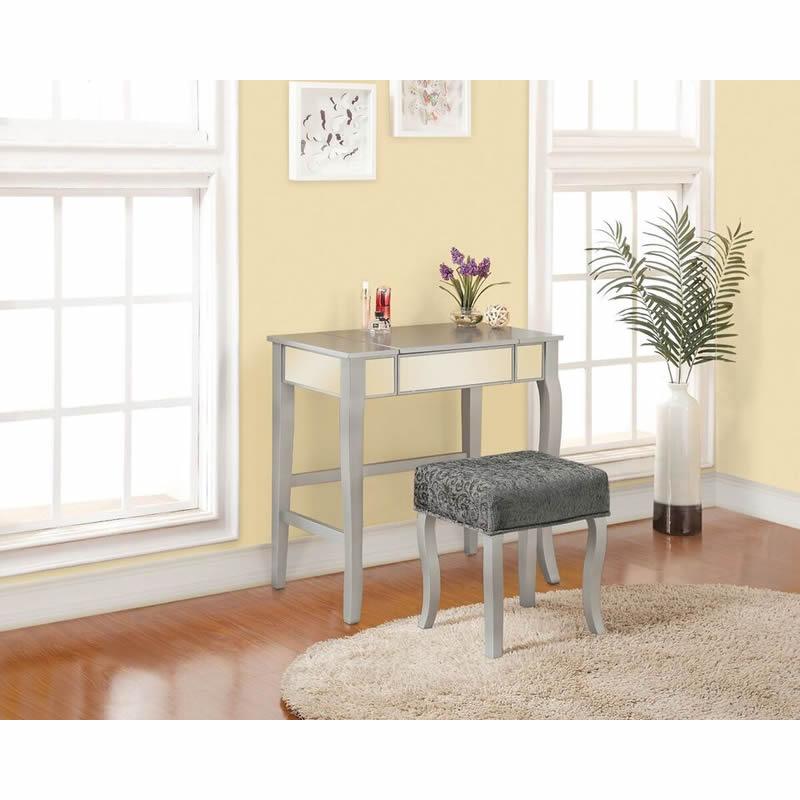 Contemporary style; Middle if the vanity lifts to reveal a mirror and storage space; Mirrored front and sides; Chair dimensions 17"W x 18"H x 14"D