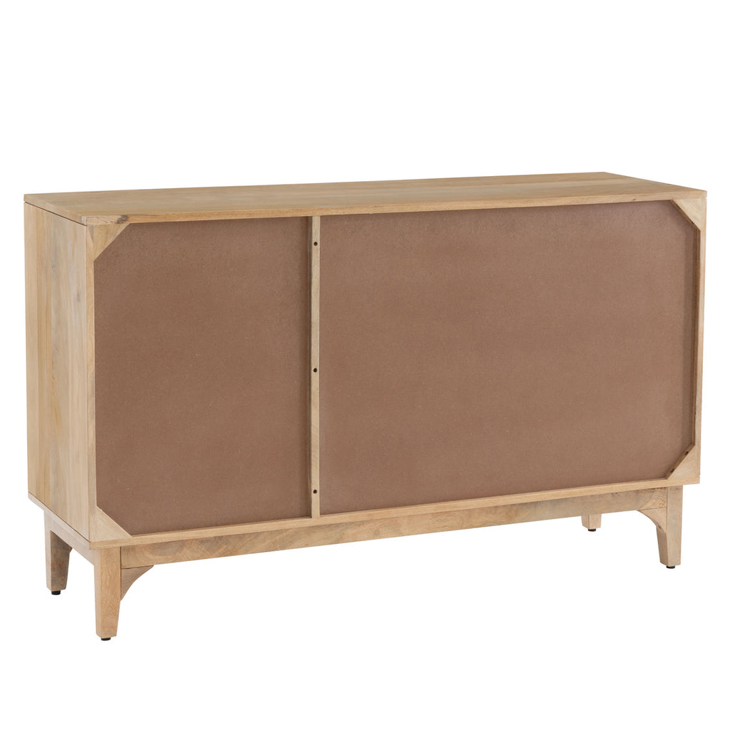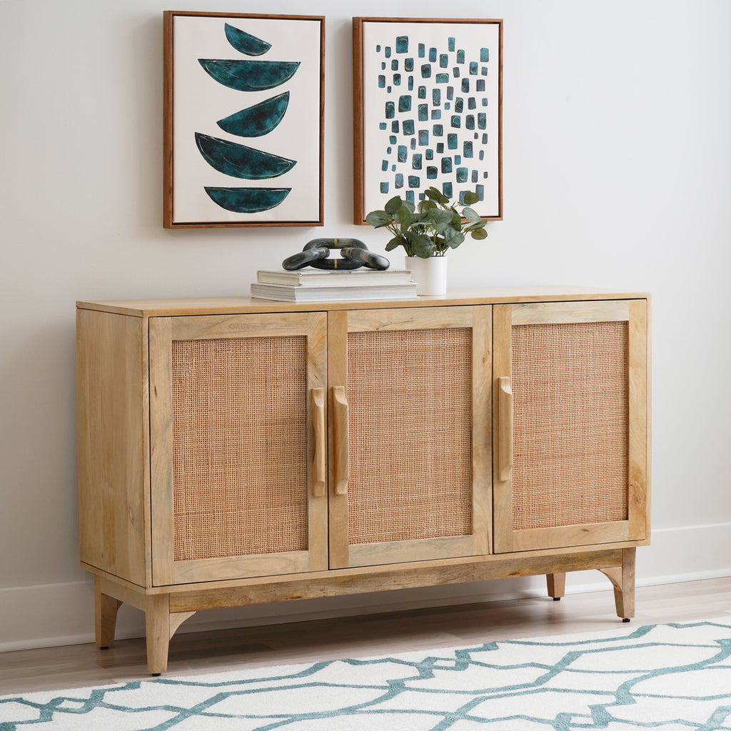 Simple and geometric, this three door cabinet offers versatile function without sacrificing distinctive style. Real cane from rattan creates natural... Simple and geometric, this three door cabinet offers versatile function without sacrificing distinctive style. Real cane from rattan creates natural texture with the 100% nautral mango wood frame. This piece complements any home in both form and function. You can use it as a media console, and entry way console, or a dining room buffet, the options are endless. Dimensions: 51 L X 16 D X 31 H View more