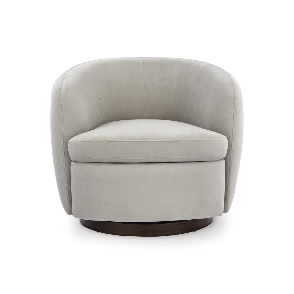 Approachable with its classic barrel design, this swivel accent chair invites stylish relaxation to the everyday. Curl up in its... Approachable with its classic barrel design, this swivel accent chair invites stylish relaxation to the everyday. Curl up in its velvet upholstered seat—relaxing with a book or your favorite show has never been so comfortably luxurious. Completing the look, a wood swivel base provides a chic contrast to the fabric’s light neutral hue. View more
