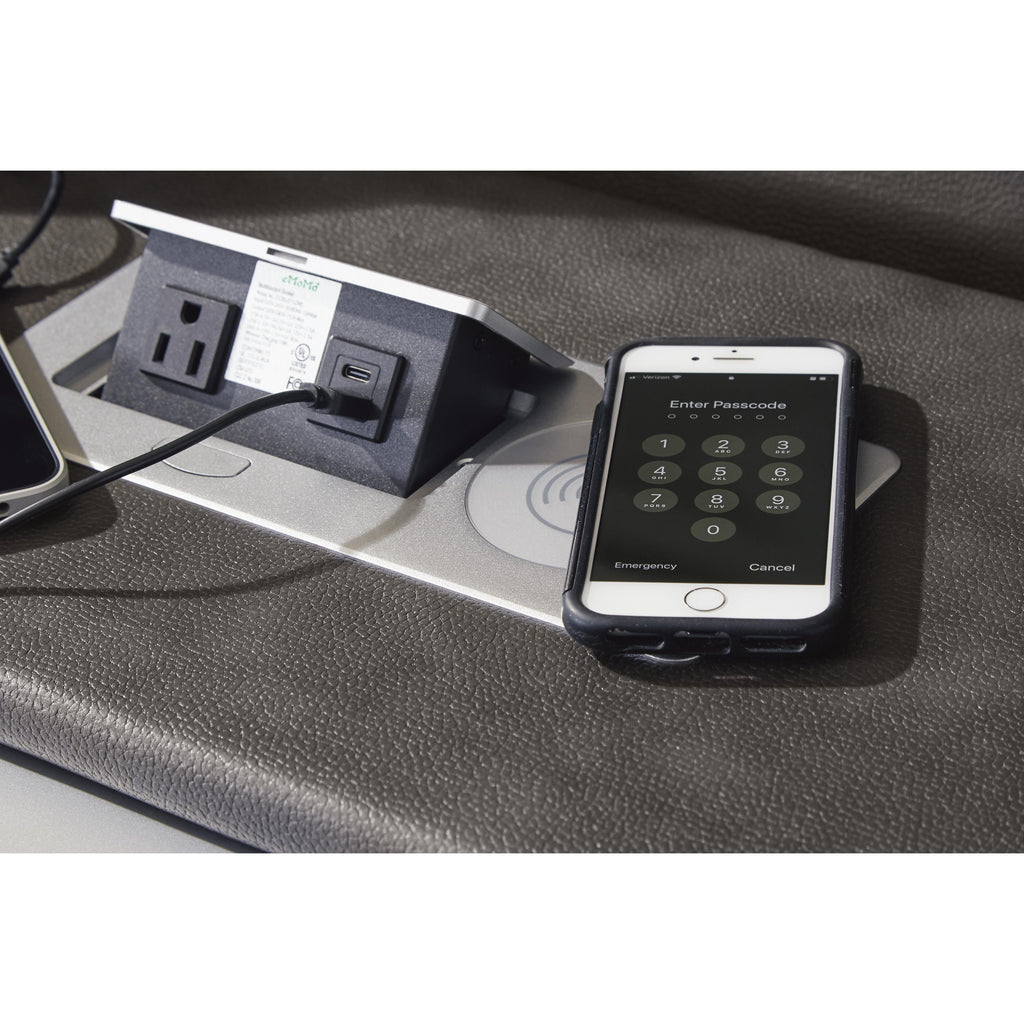 • Drop-down table with LED reading lights, dual cup holders, electrical outlet, USB charging port and wireless charging