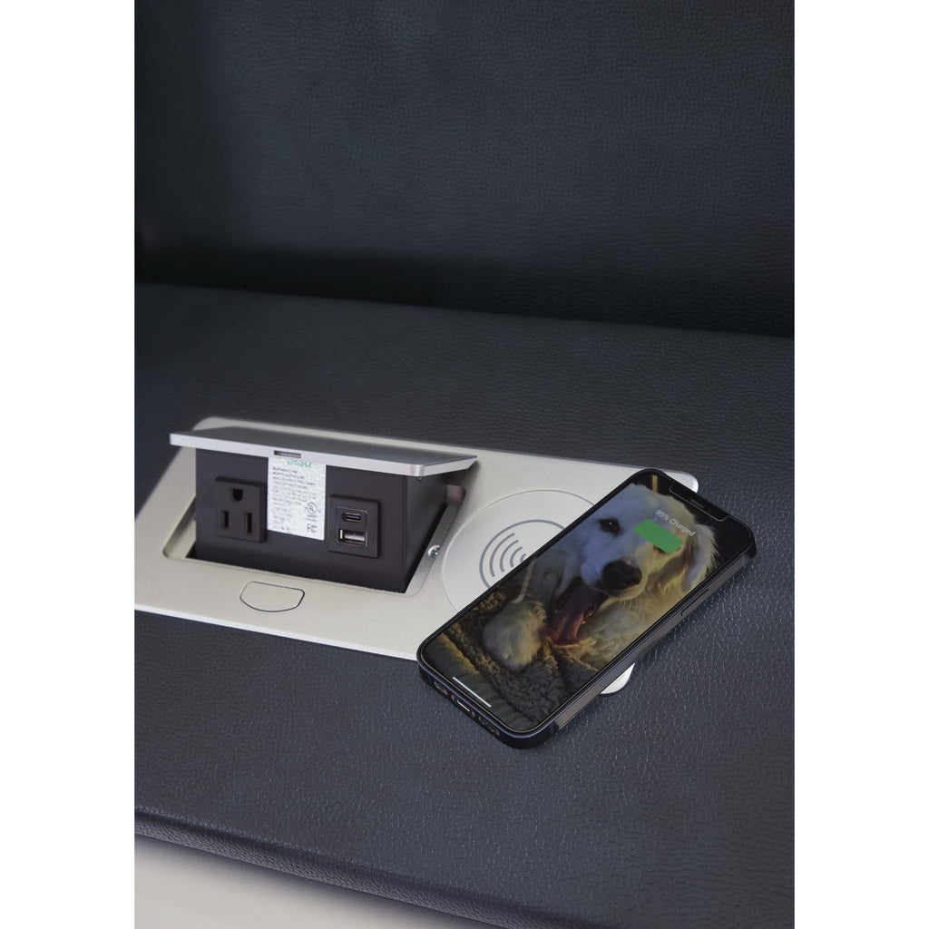 • Drop-down table with LED reading lights, dual cup holders, electrical outlet, USB charging port and wireless charging