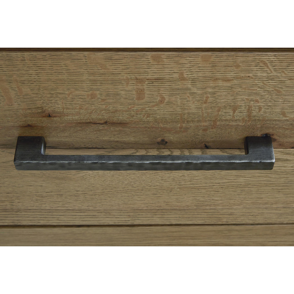 • Metal bar pulls with rustic texture in a dark pewter-tone finish
